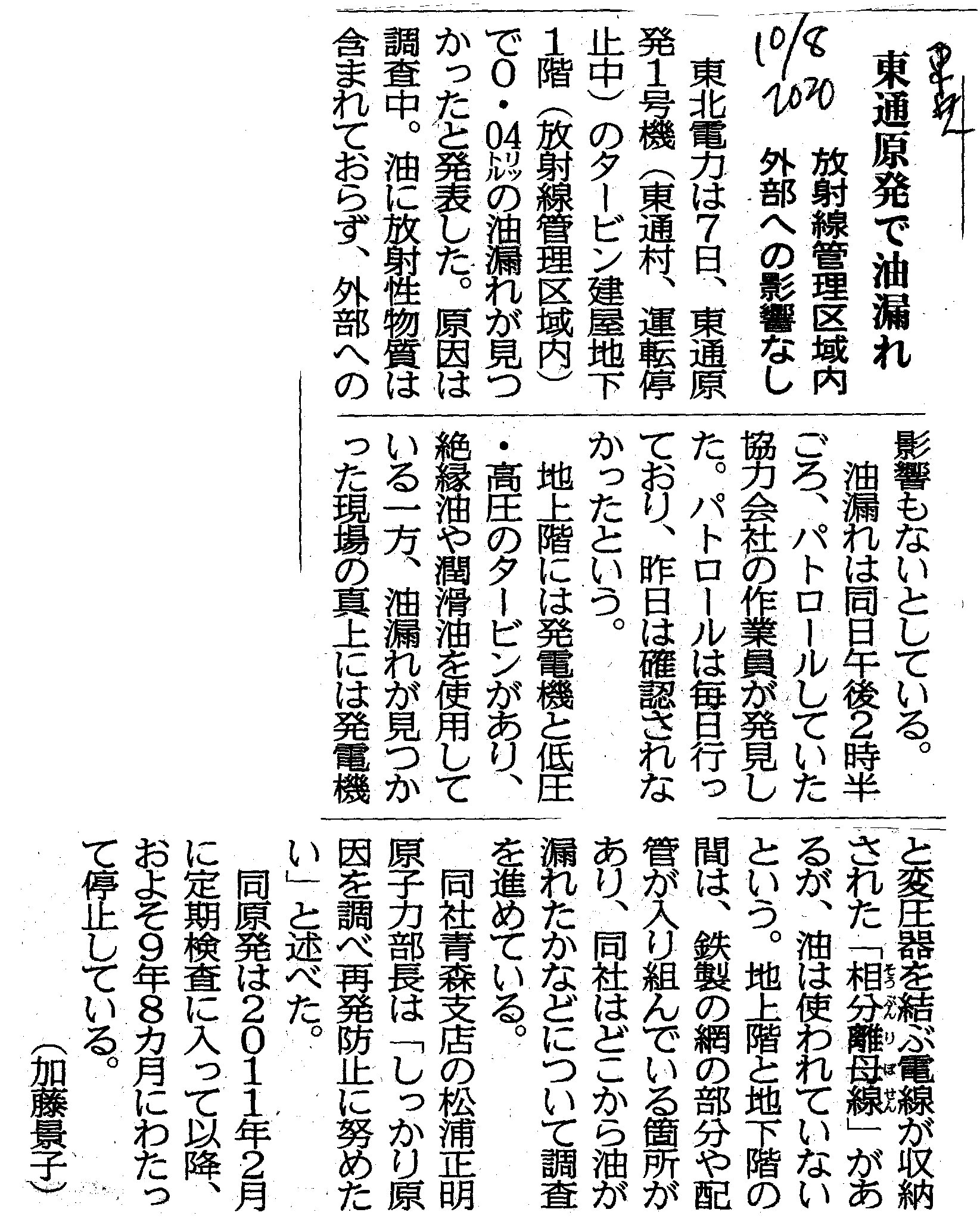 | [2020_10_08_12]東通原発で油漏れ 放射線管理区域内 外部への影響なし(東奥日報2020年10月8日) |