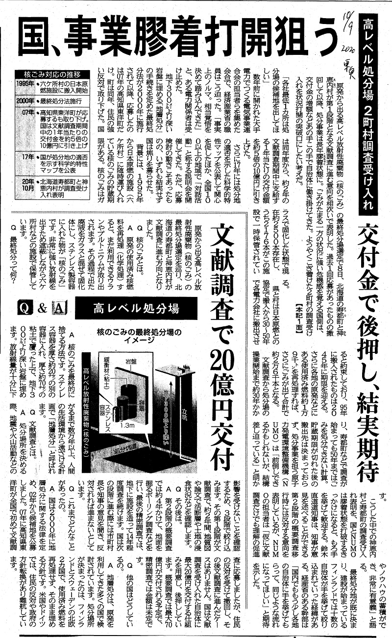 | [2020_10_09_10]高レベル処分場 2町村調査受け入れ 交付金で後押し、結実期待 国、事業膠着打開狙う Q&A 高レベル処分場 文献調査で20億円交付(東奥日報2020年10月9日) |
