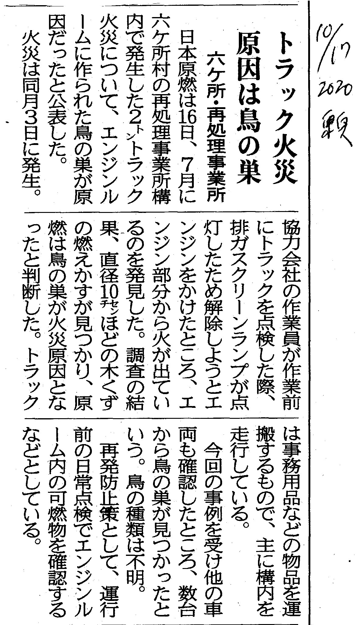 | [2020_10_17_07]トラック火災 原因は鳥の巣 六ケ所・再処理事業所(東奥日報2020年10月17日) |