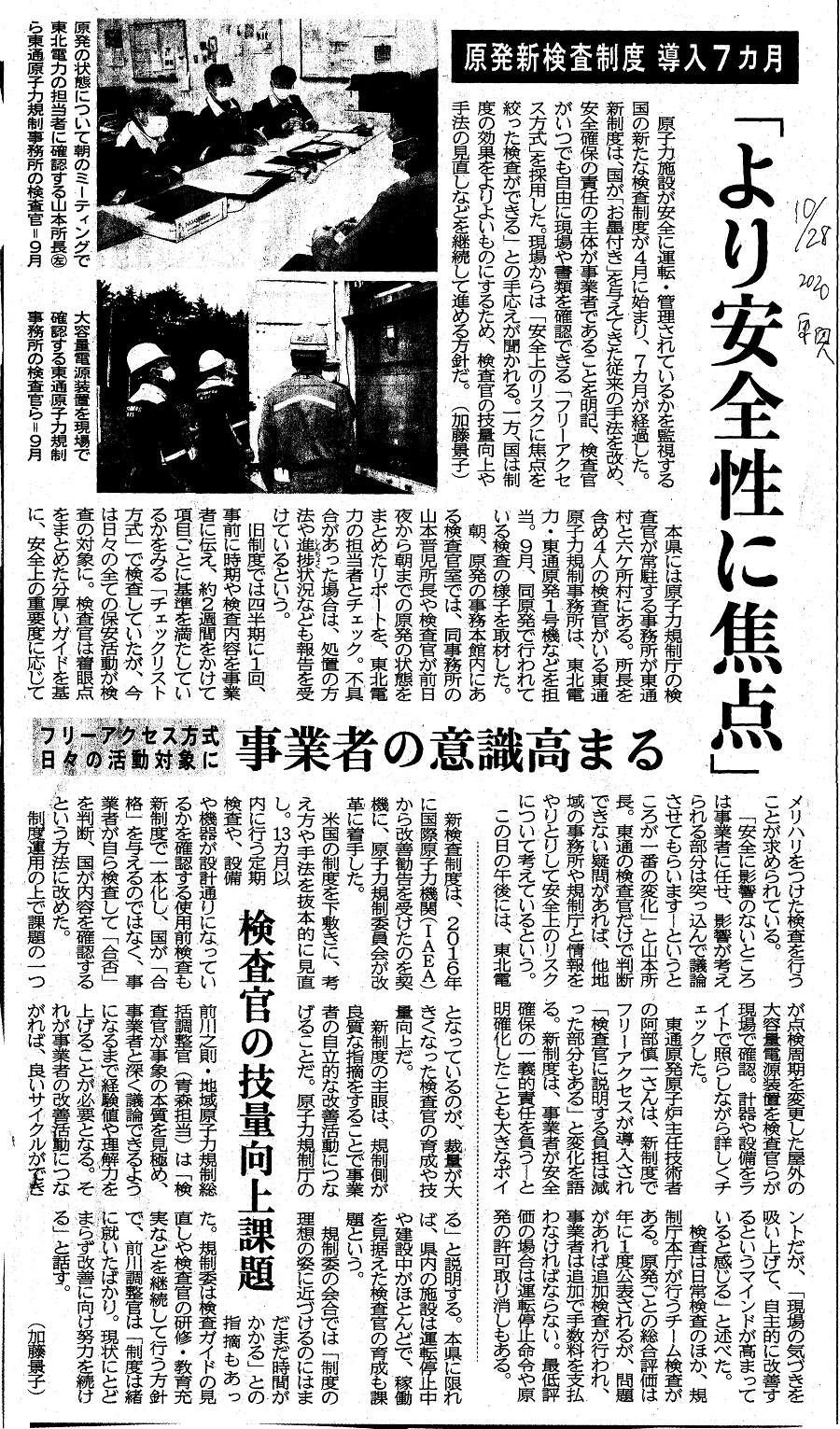 | [2020_10_28_09]原発新検査制度 導入7カ月 「より安全性に焦点」 フリーアクセス方式 日々の活動対象に 事業者の意識高まる 検査官の技量向上課題(東奥日報2020年10月28日) |