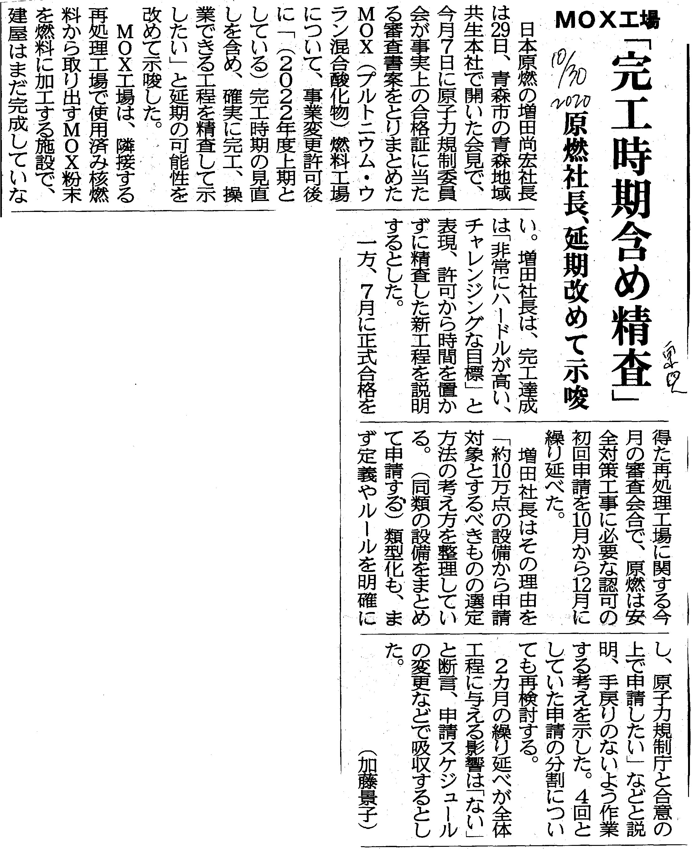 | [2020_10_30_01]MOX工場 「完工時期含め精査」 原燃社長、延期改めて示唆(東奥日報2020年10月30日) |