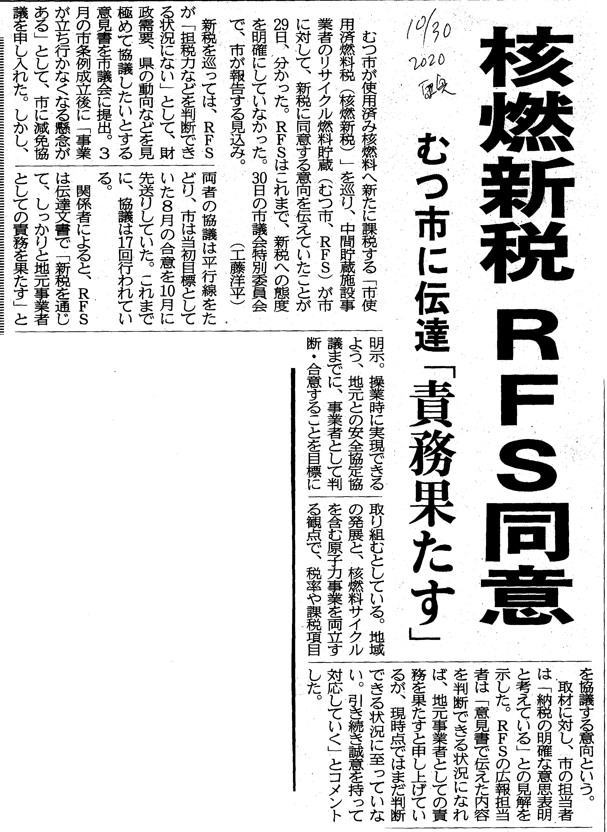 | [2020_10_30_02]核燃新税 RFS同意 むつ市に伝達 「責務果たす」(東奥日報2020年10月30日) |