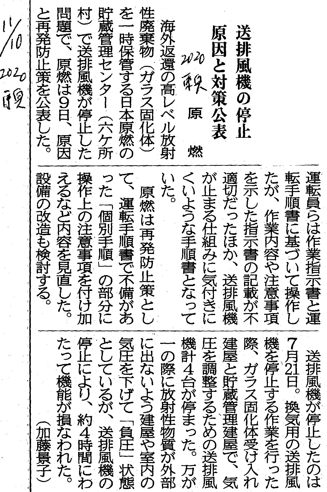 | [2020_11_10_01]送排風機の停止 原因と対策公表 原燃(東奥日報2020年11月10日) |