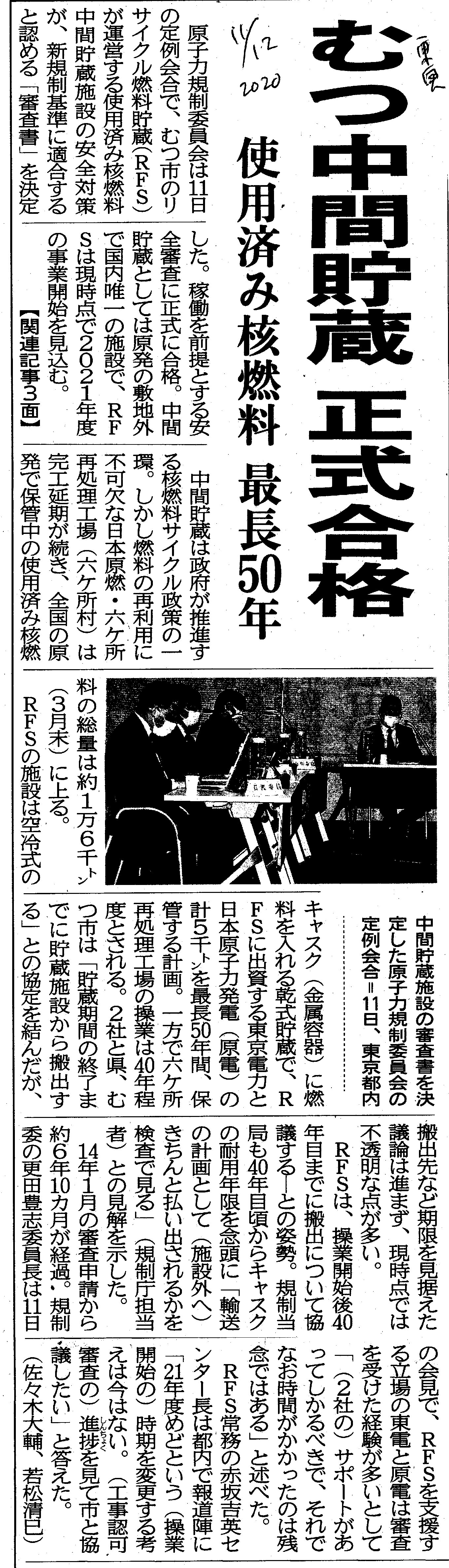 | [2020_11_12_07]むつ中間貯蔵 正式合格 使用済み核燃料 最長50年(東奥日報2020年11月12日) |