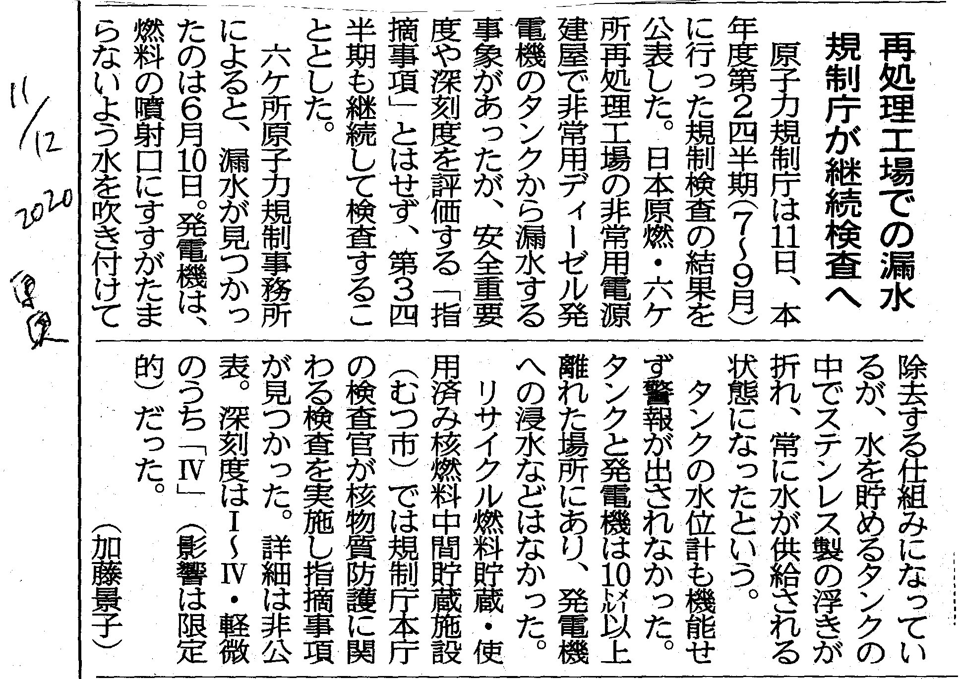 | [2020_11_12_09]再処理工場での漏水 規制庁が継続検査へ(東奥日報2020年11月12日) |