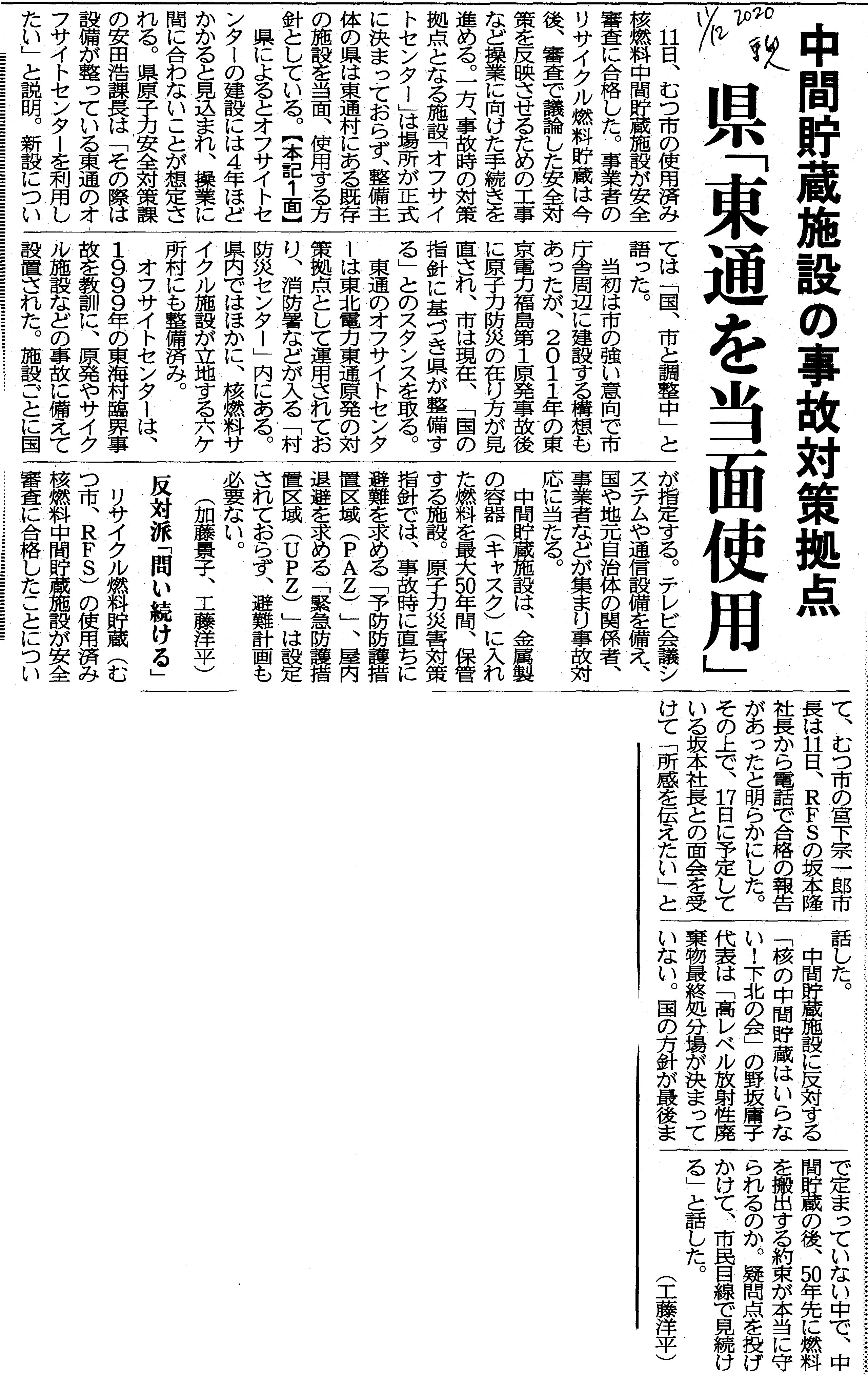 | [2020_11_12_10]中間貯蔵施設の事故対策拠点 県「東通を当面使用」 反対派 「問い続ける」(東奥日報2020年11月12日) |