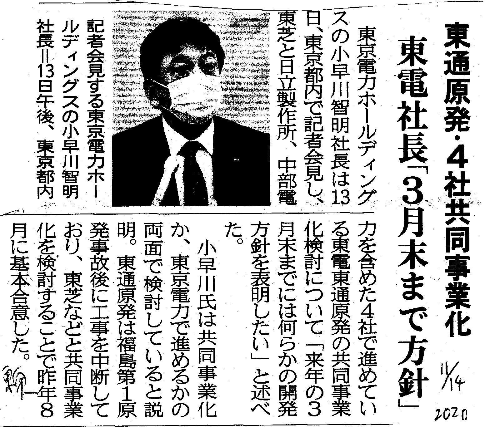 | [2020_11_14_06]東通原発・4社共同事業化 東電社長「3月末まで方針」(東奥日報2020年11月14日) |