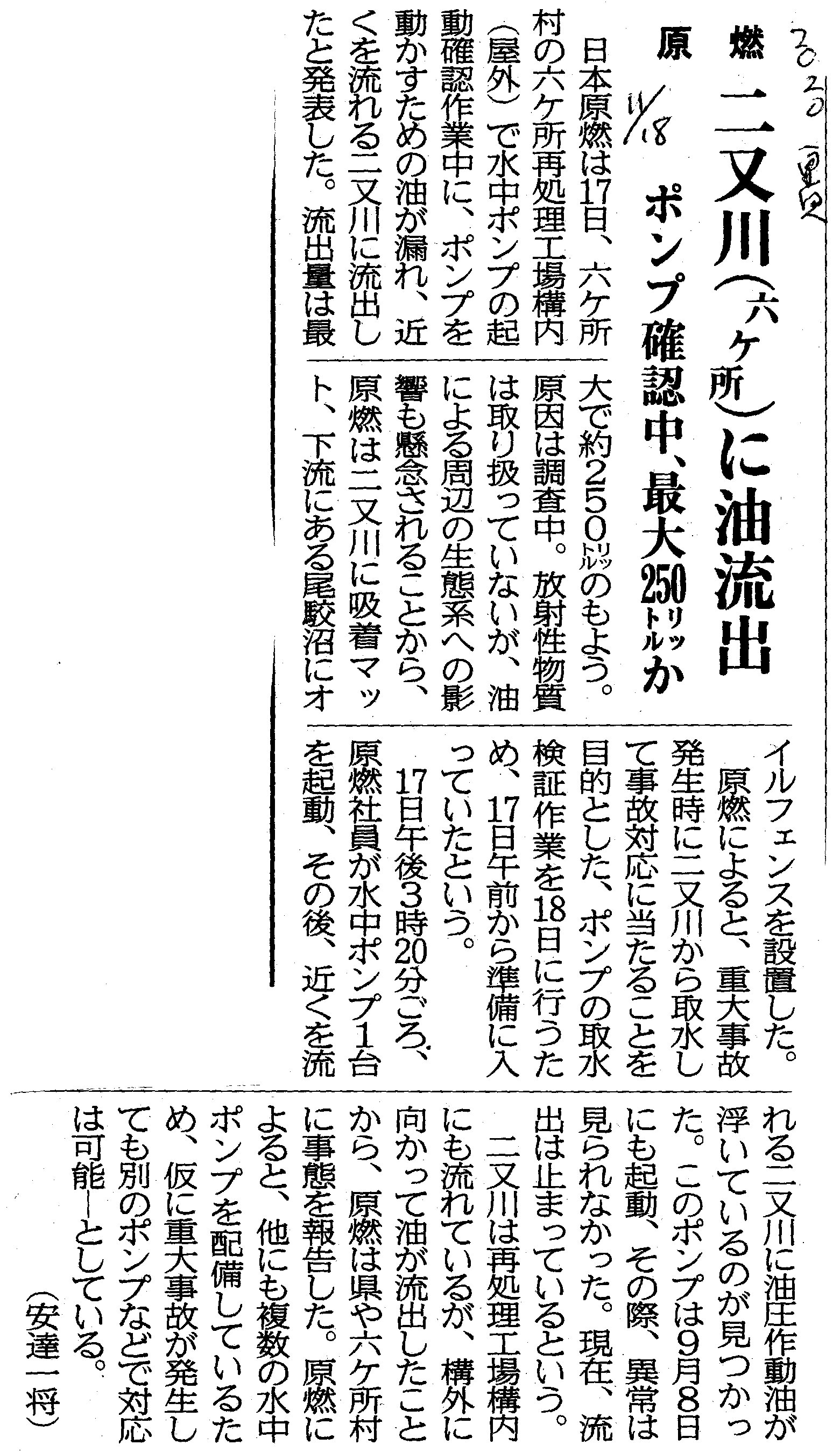 | [2020_11_18_07]原燃 二又川(六ケ所)に油流出 ポンプ確認中、最大250リットルか(東奥日報2020年11月18日) |