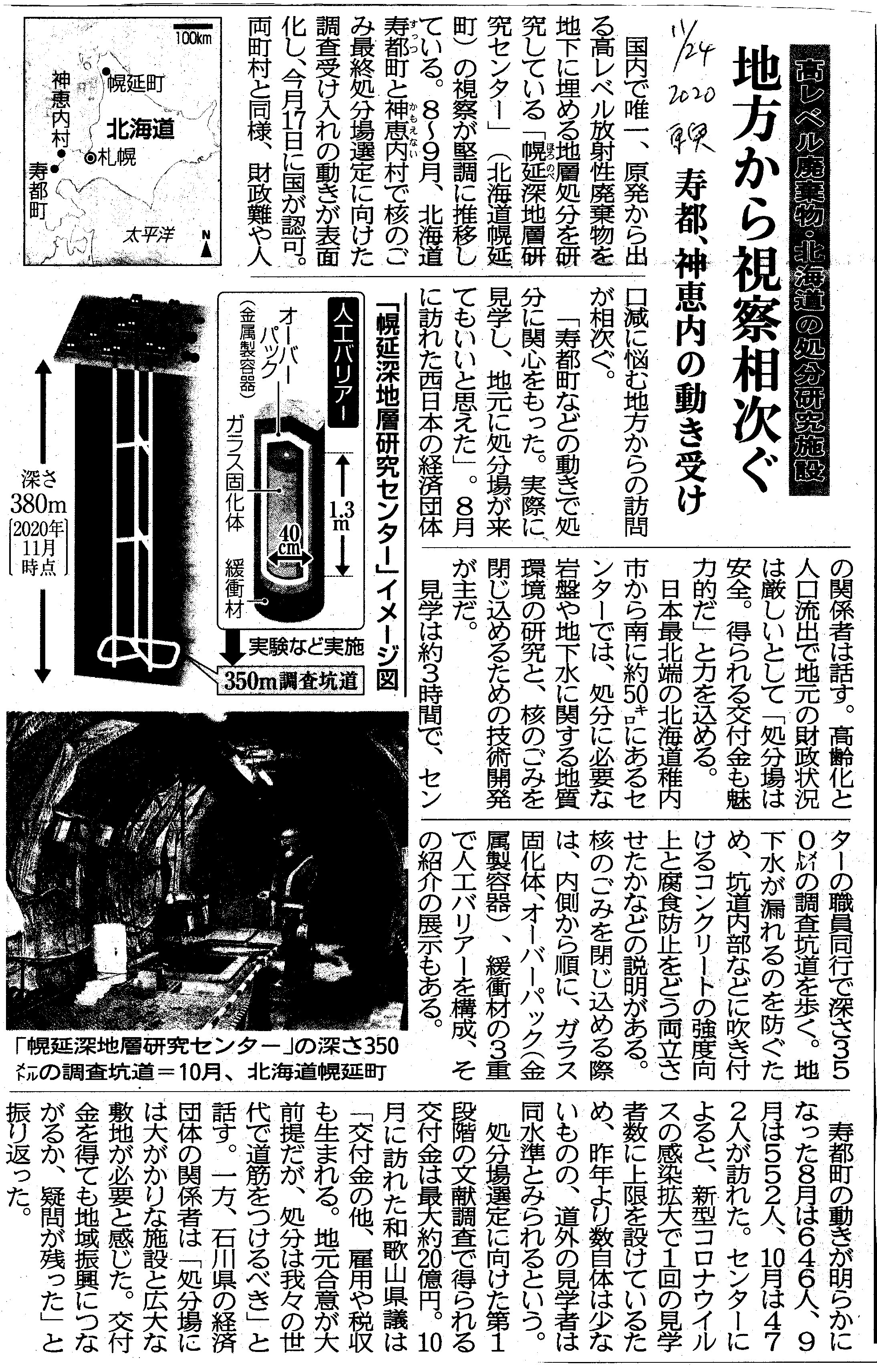 [2020_11_24_06]高レベル廃棄物・北海道の処分研究施設 地方から視察相次ぐ 寿都、神恵内の動き受け(東奥日報2020年11月24日)