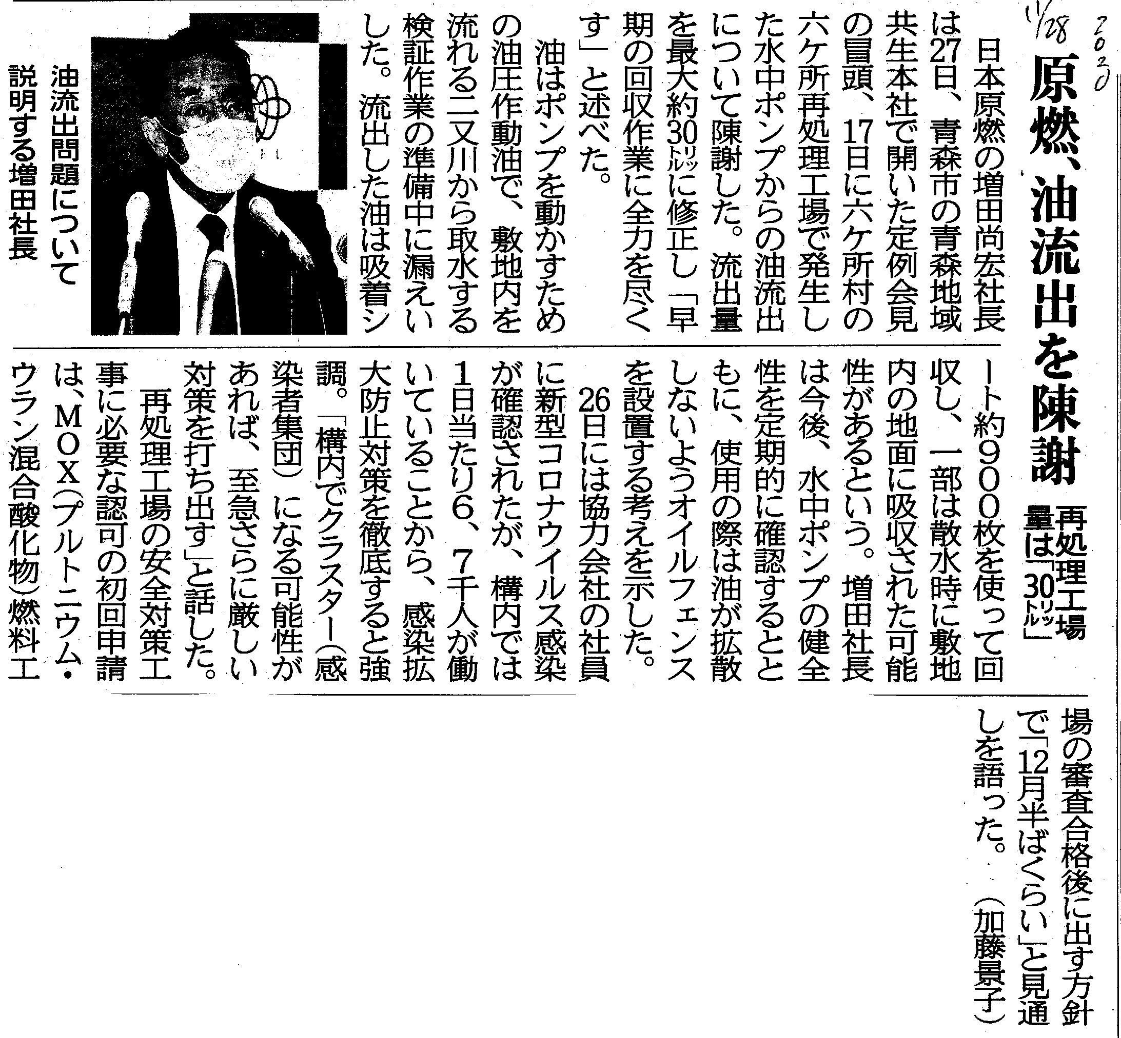 | [2020_11_28_01]原燃、油流出を陳謝 再処理工場 量は「30」リットル(東奥日報2020年11月28日) |