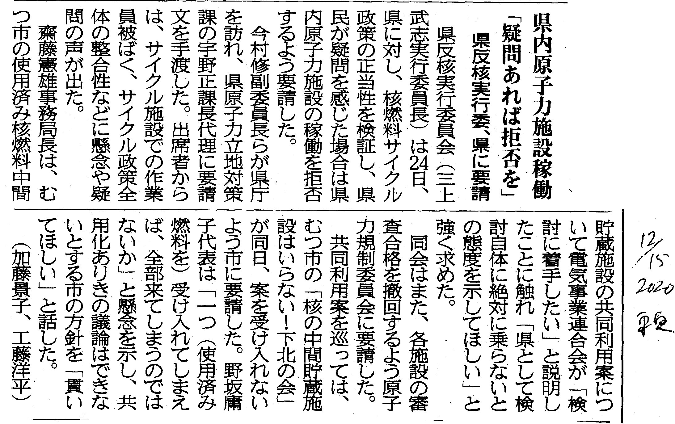 | [2020_12_15_02]県内原子力施設稼働「疑問あれば拒否を」 県反核実行委、県に要請(東奥日報2020年12月15日) |