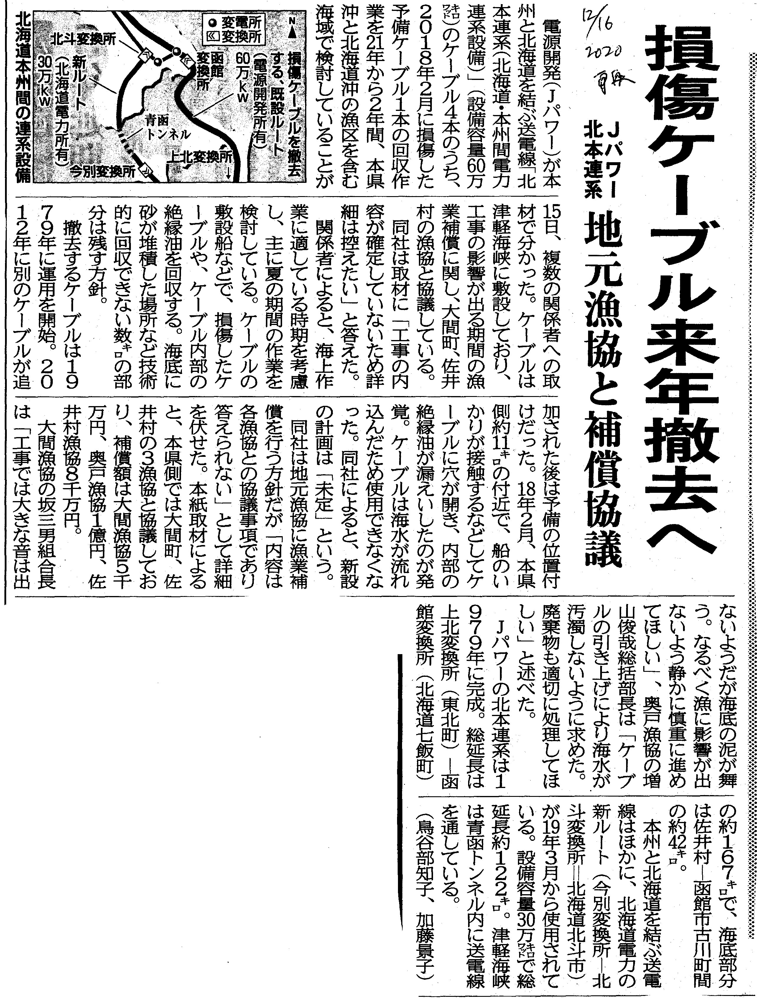 [2020_12_16_05]損傷ケーブル来年撤去へ Jパワー北本連系 地元漁協と補償協議(東奥日報2020年12月16日)