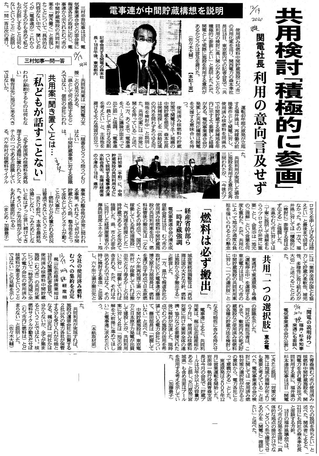 | [2020_12_19_06]電事連が中間貯蔵構想を説明 共用検討「積極的に参画」 関電社長 利用の意向言及せず 共用「一つの選択肢」 東北電 「燃料は必ず搬出」 経産省幹部ら一時貯蔵強調 「関電の説明待つ」 福井・杉本知事 来週にも面談へ 全社の使用済み燃料 むつへの集約を否定 経産相 三村知事一問一答 共用案「聞き置く」とは・・・ 「私どもが話すことない」(東奥日報2020年12月19日) |