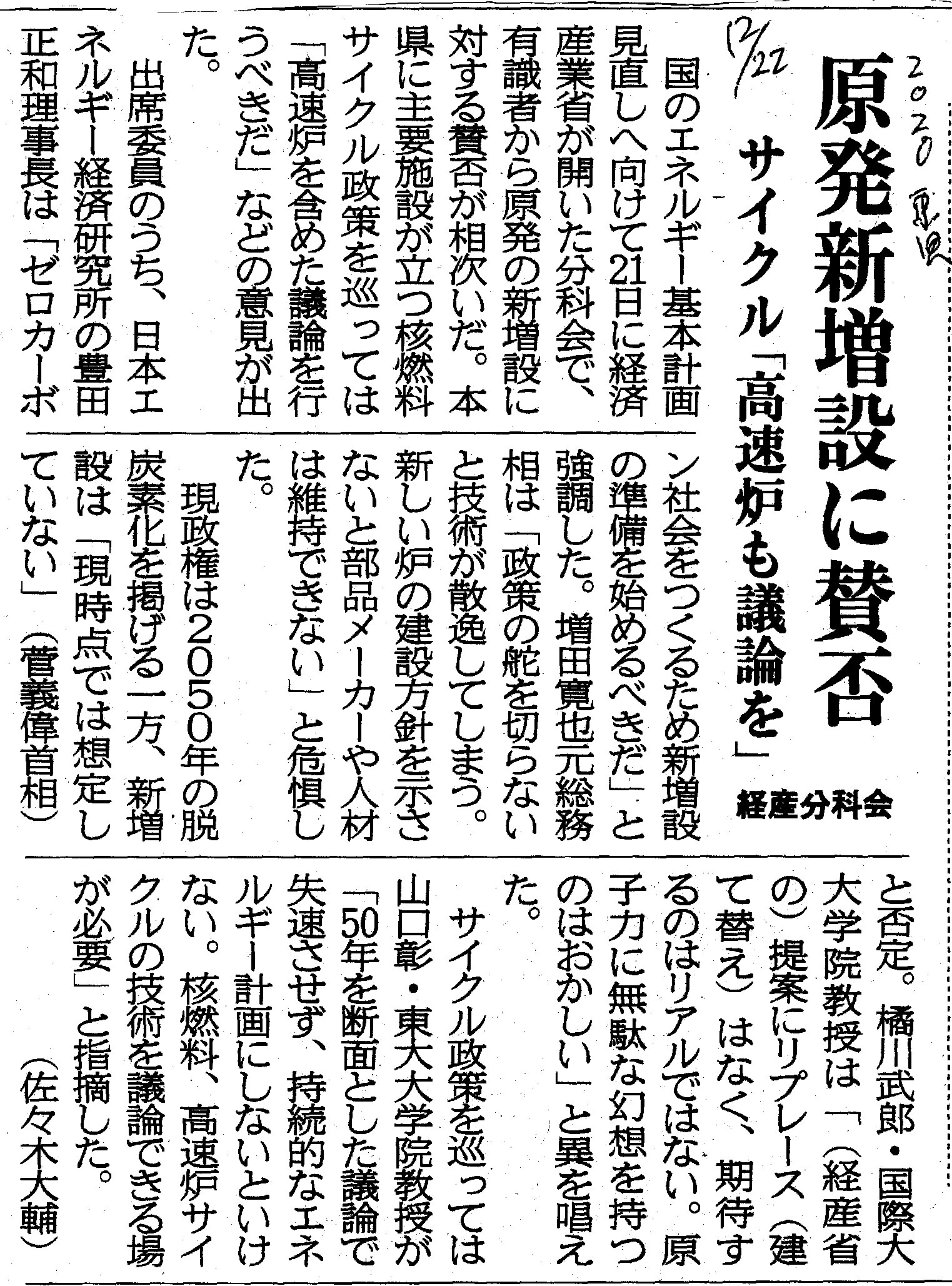 [2020_12_22_01]原発新増設に賛否 サイクル「高速炉も議論を」 経産分科会(東奥日報2020年12月22日)