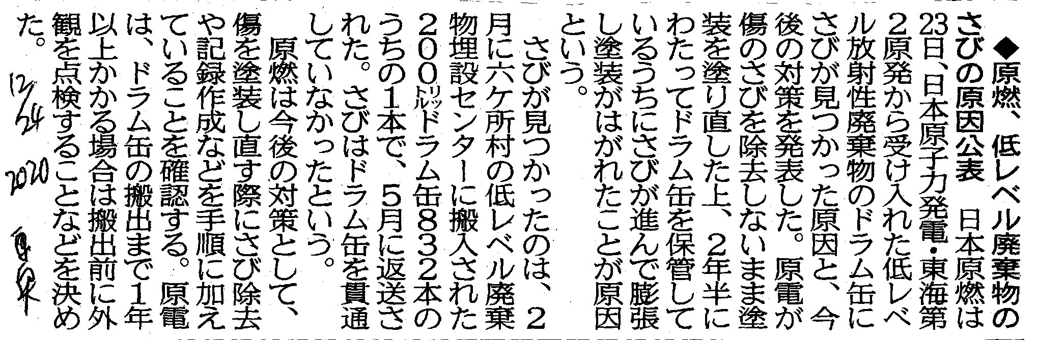 | [2020_12_24_06]原燃、低レベル廃棄物のさびの原因公表(東奥日報2020年12月24日) |