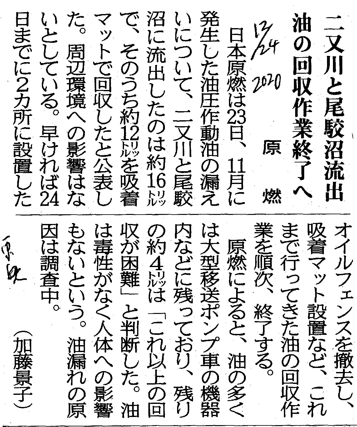 | [2020_12_24_08]二又川と尾鮫沼 流出油の回収作業終了へ 原燃(東奥日報2020年12月24日) |
