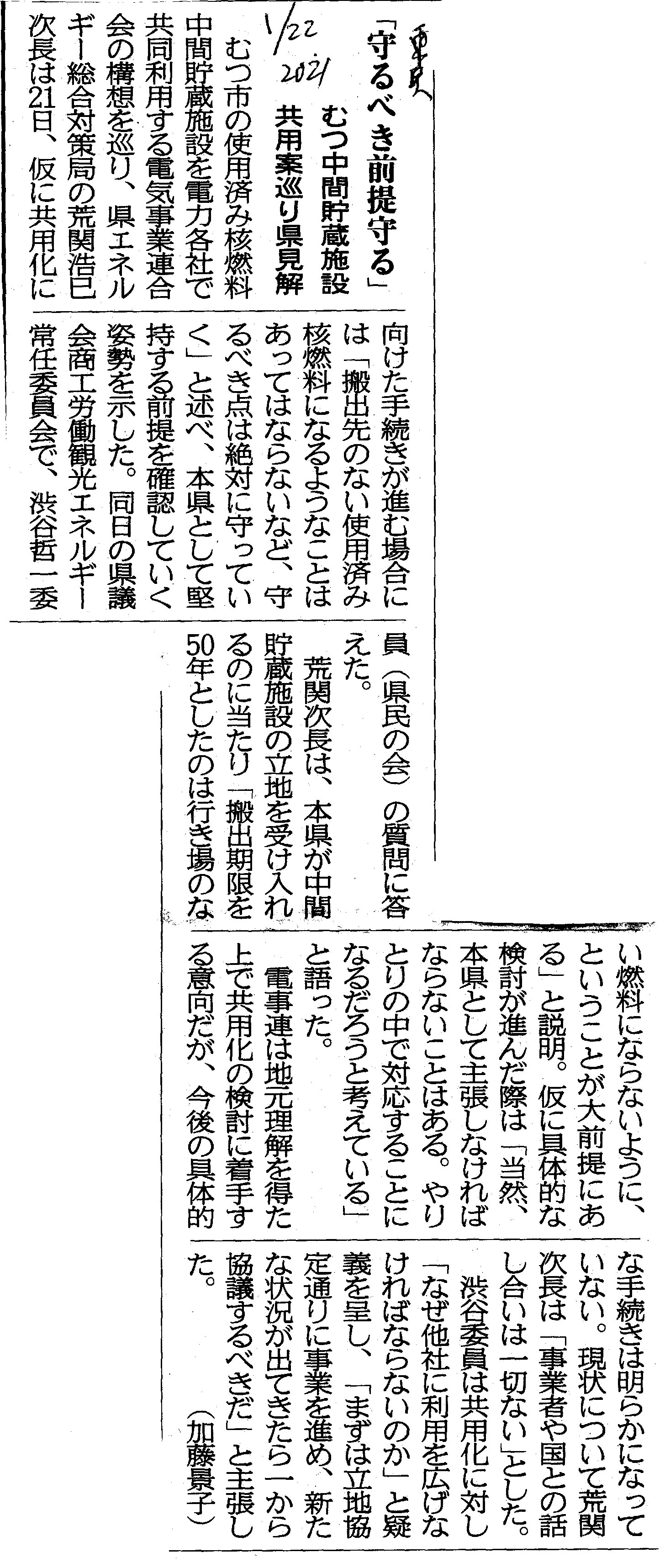 | [2021_01_22_02]「守るべき前提守る」 むつ中間貯蔵施設共用案巡り県見解(東奥日報2021年1月22日) |