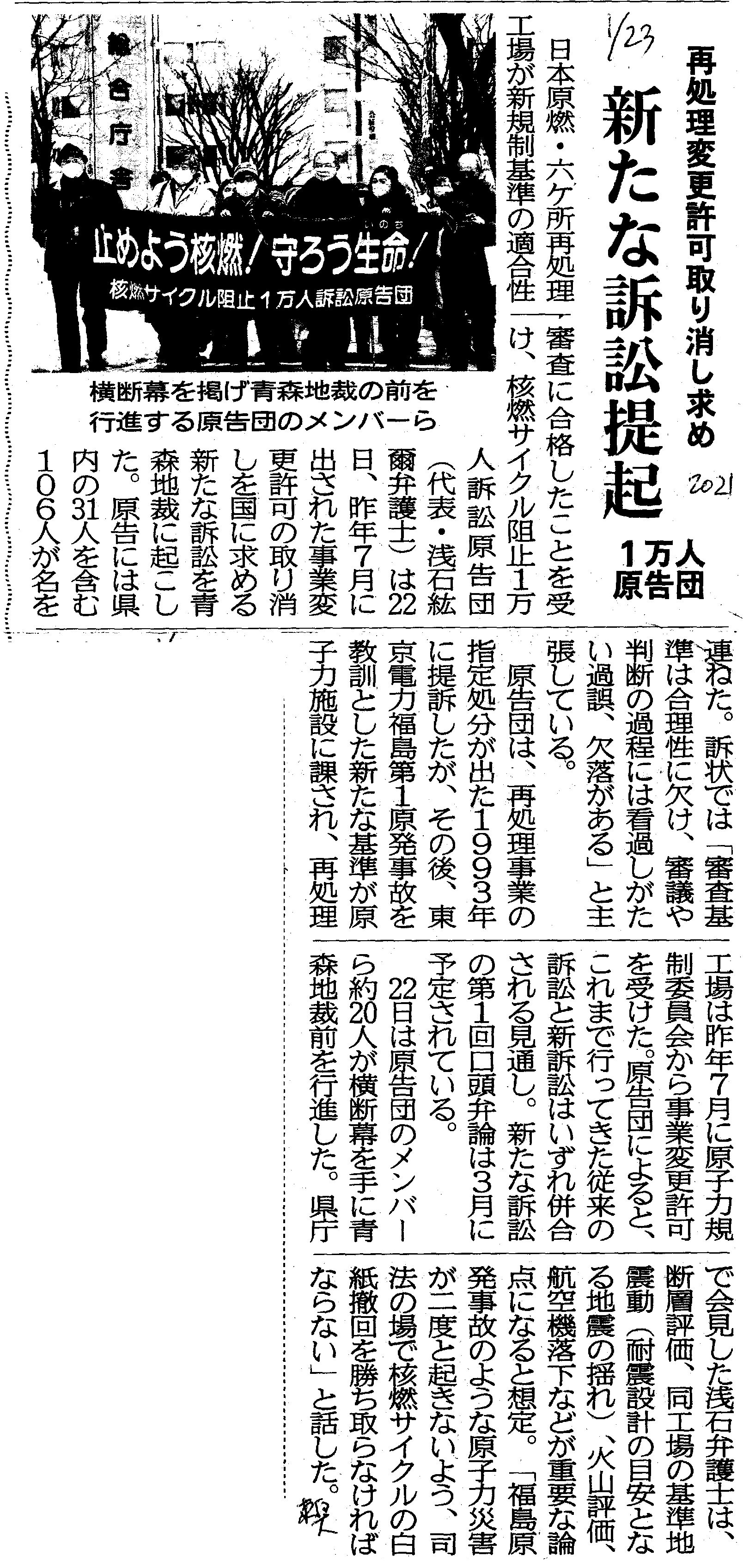 [2021_01_23_02]再処理変更許可取り消し求め 新たな訴訟提起 1万人原告団(東奥日報2021年1月23日)