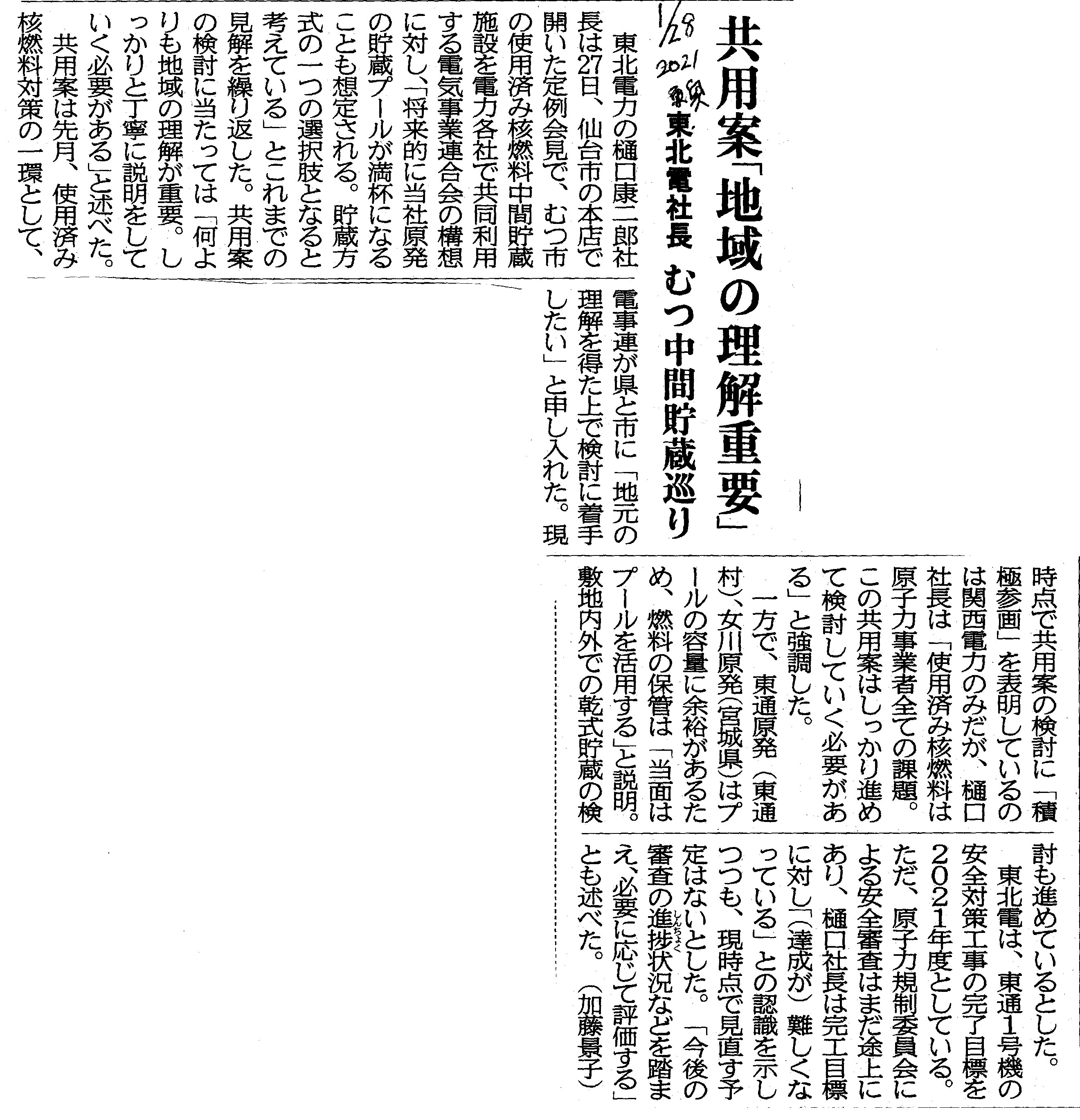 | [2021_01_28_01]共用案「地域の理解重要」東北電社長 むつ中間貯蔵巡り(東奥日報2021年1月28日) |