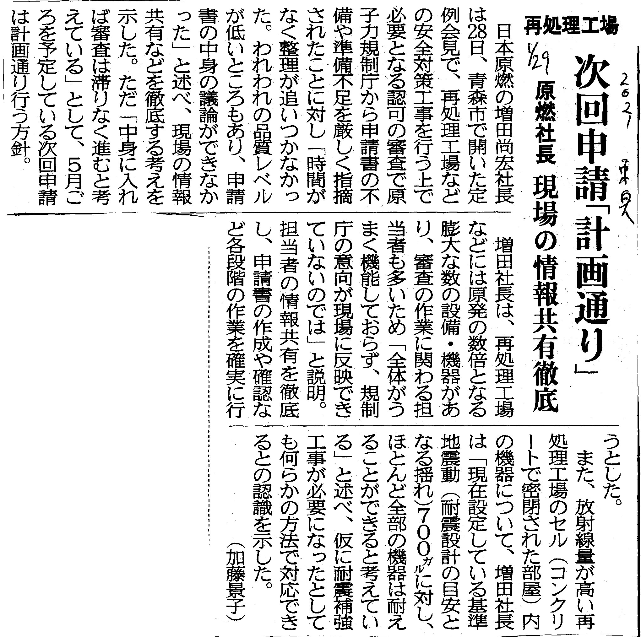 | [2021_01_29_01]再処理工場 次回申請「計画通り」原燃社長 現場の情報共有徹底(東奥日報2021年1月29日) |