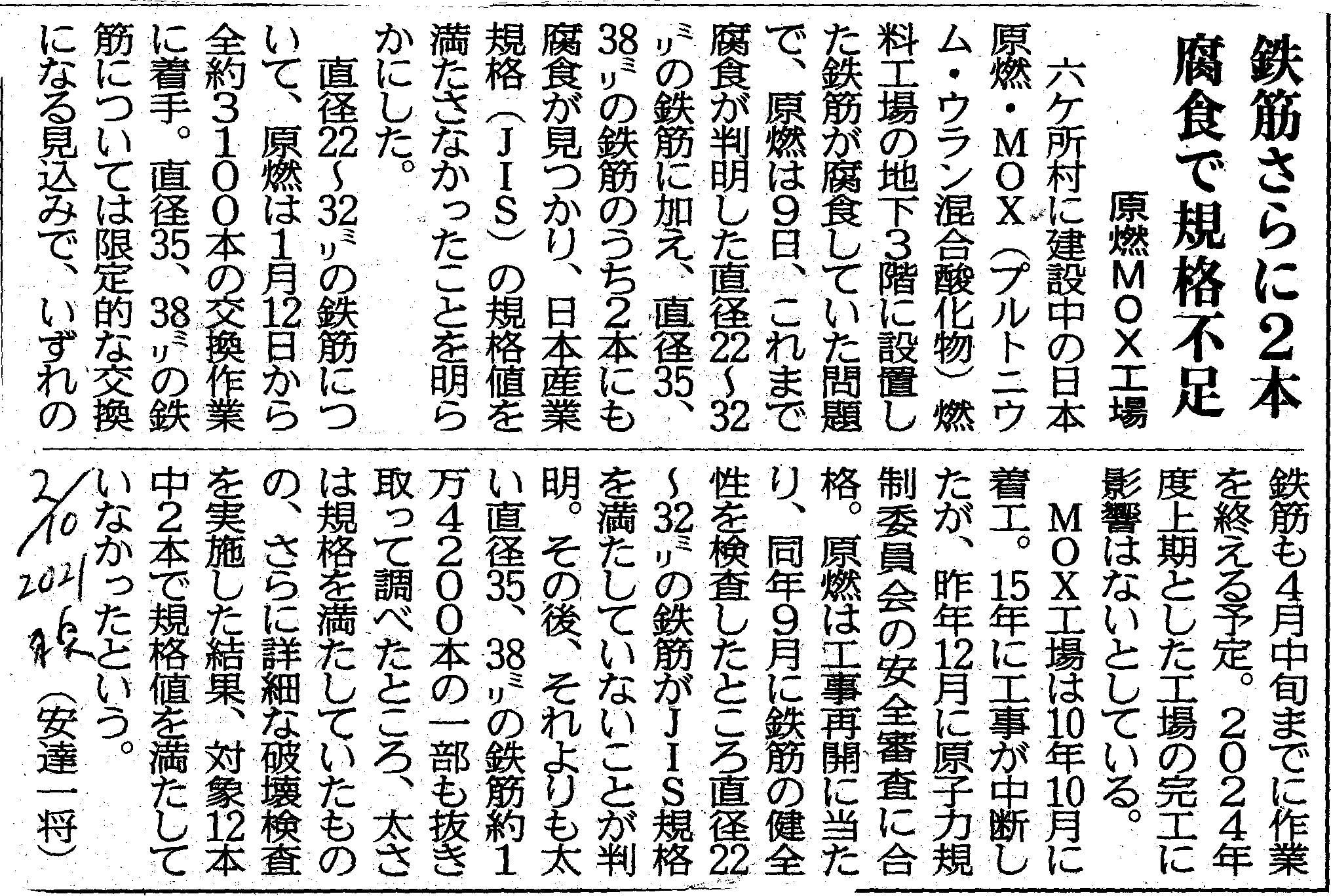 | [2021_02_10_08]鉄筋さらに2本腐食で規格不足 原燃MOX工場(東奥日報2021年2月10日) |
