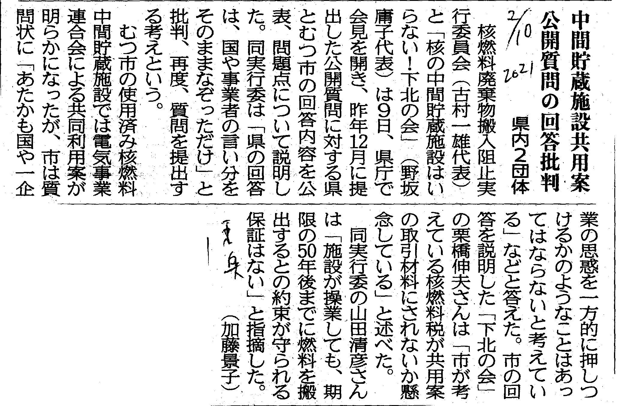 | [2021_02_10_09]中間貯蔵施設共用案 公開質問の回答批判 県内2団体(東奥日報2021年2月10日) |
