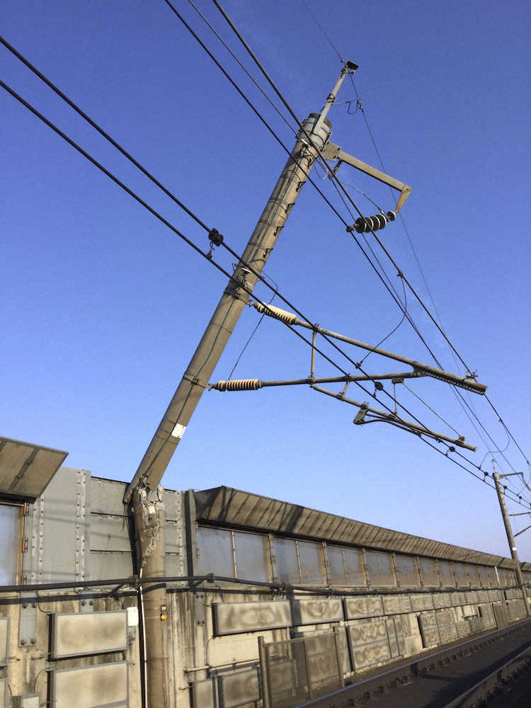 [2021_02_15_02]東北新幹線の郡山―福島間で折れているのが見つかった電柱(JR東日本提供) (JR東日本2021年2月15日)