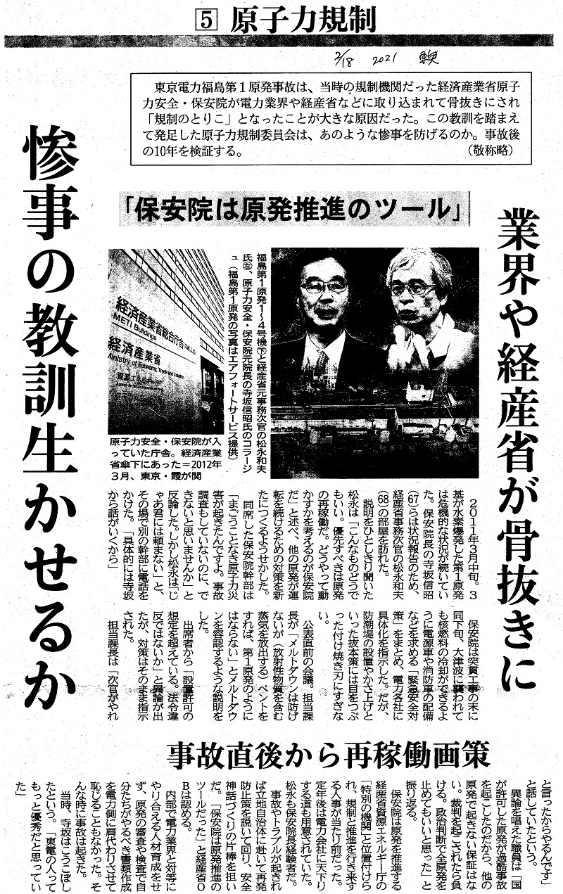 | [2021_02_18_08]検証 東日本大震災10年 5 原子力規制 惨事の経験生かせるか 「保安院は原発推進のツール」 業界や経産省が骨抜きに 事故直後から再稼働画策(東奥日報2021年2月18日) |
