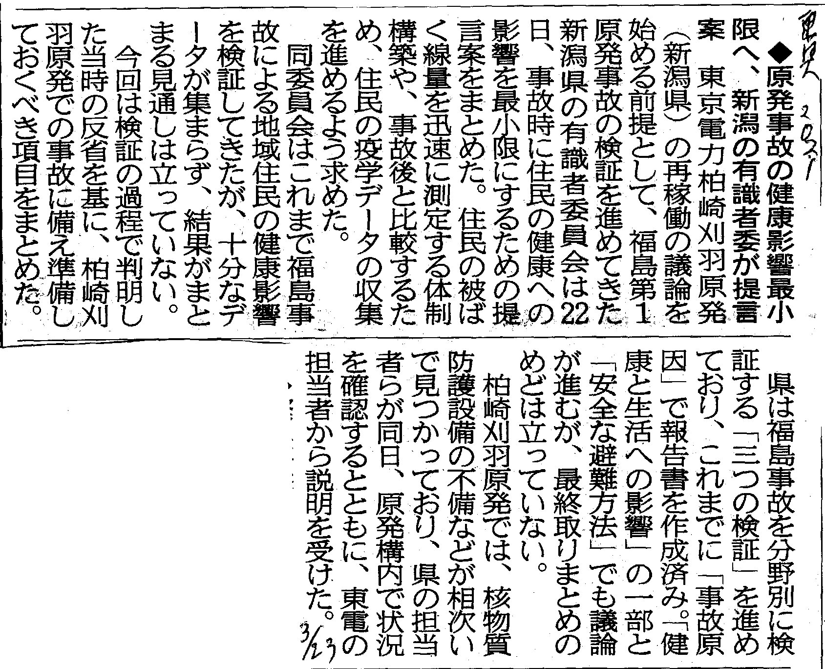 [2021_03_23_05]原発事故の健康影響最小限へ、新潟の有識者委が提言案(東奥日報2021年3月23日)