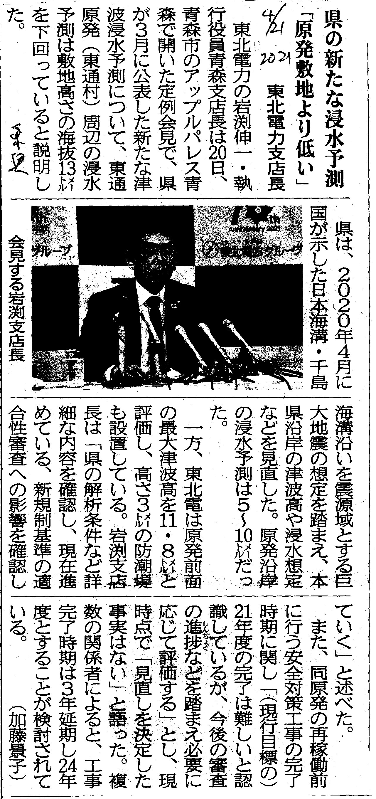 | [2021_04_21_08]県の新たな浸水予測 「原発敷地より低い」 東北電力支店長(東奥日報2021年4月21日) |