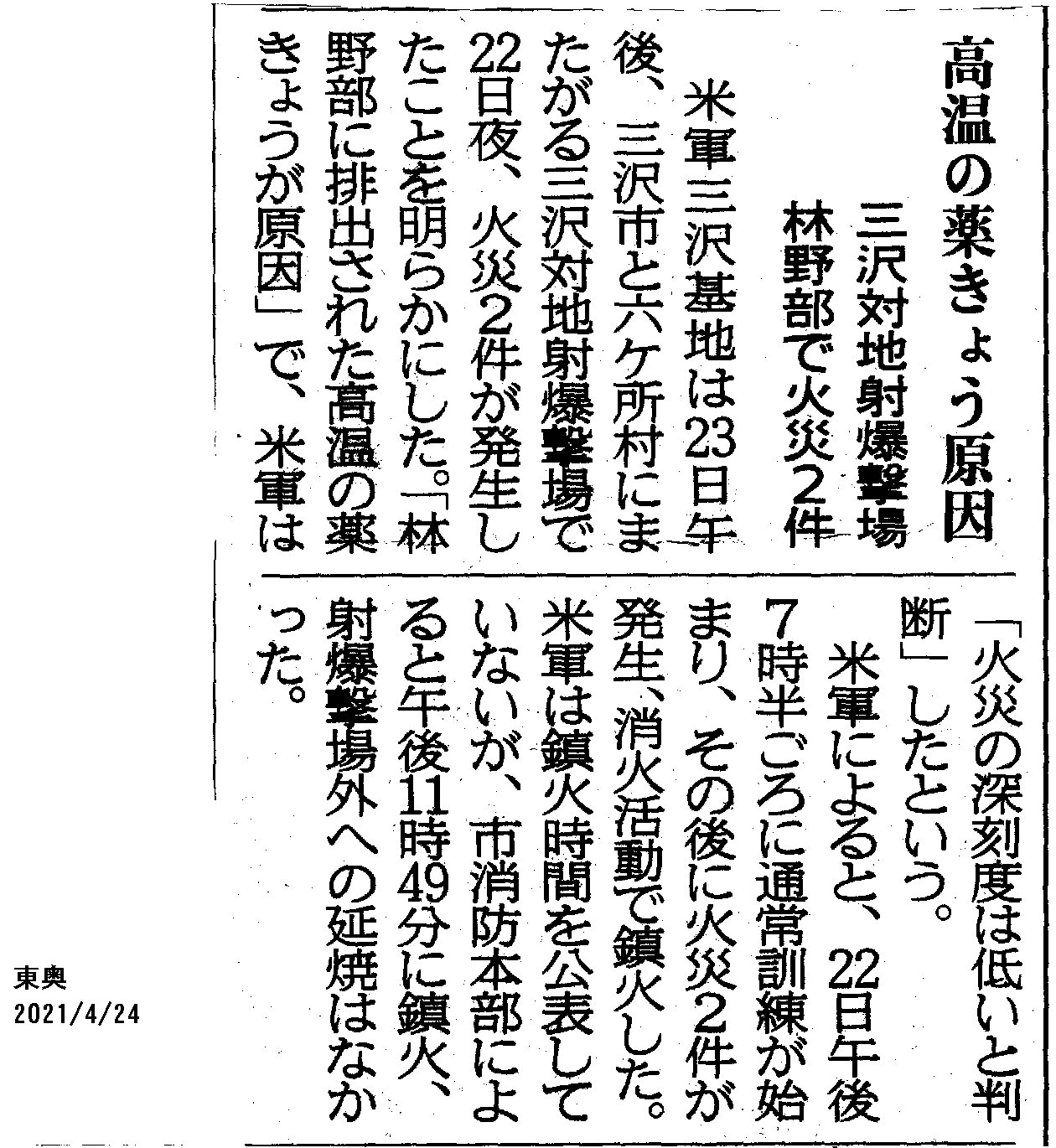 [2021_04_24_05]高温の薬きょう原因 三沢対地射爆撃場 林野部で火災2件(東奥日報2021年4月24日)