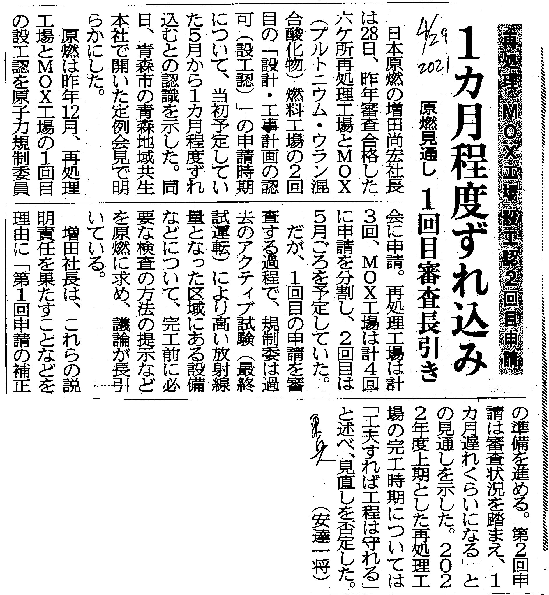| [2021_04_29_01]再処理 MOX工場 設工認2回目申請 1カ月程度ずれ込み 原燃見通し 1回目審査長引き(東奥日報2021年4月29日) |