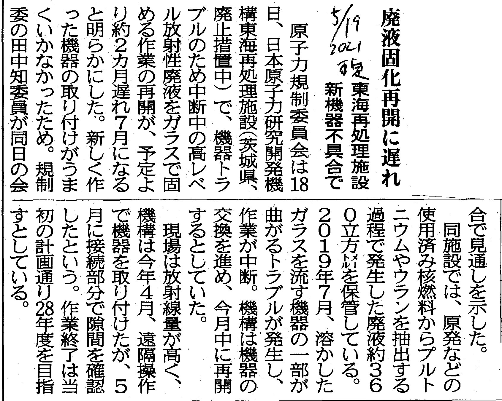 [2021_05_19_06]廃液固化再開に遅れ 東海再処理施設 新機器不具合で(東奥日報2021年5月19日)