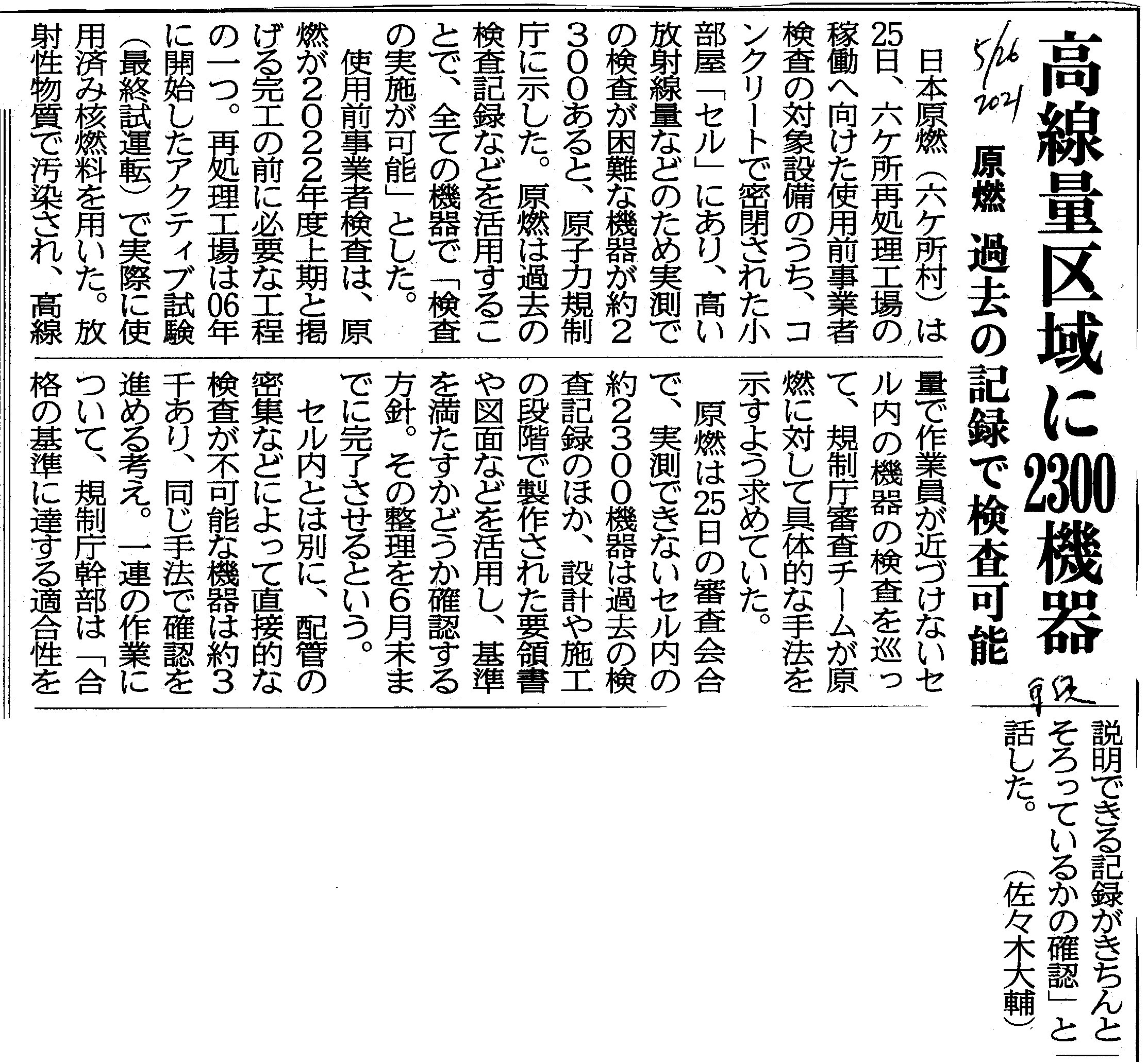 | [2021_05_26_01]高線量区域に2300機器 原燃 過去の記録で検査可能(東奥日報2021年5月26日) |