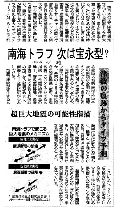 | [2021_06_01_04]南海トラフ 次は宝永型? 津波の痕跡からタイプ予測 超大型地震の可能性指摘(東奥日報2021年6月1日) |