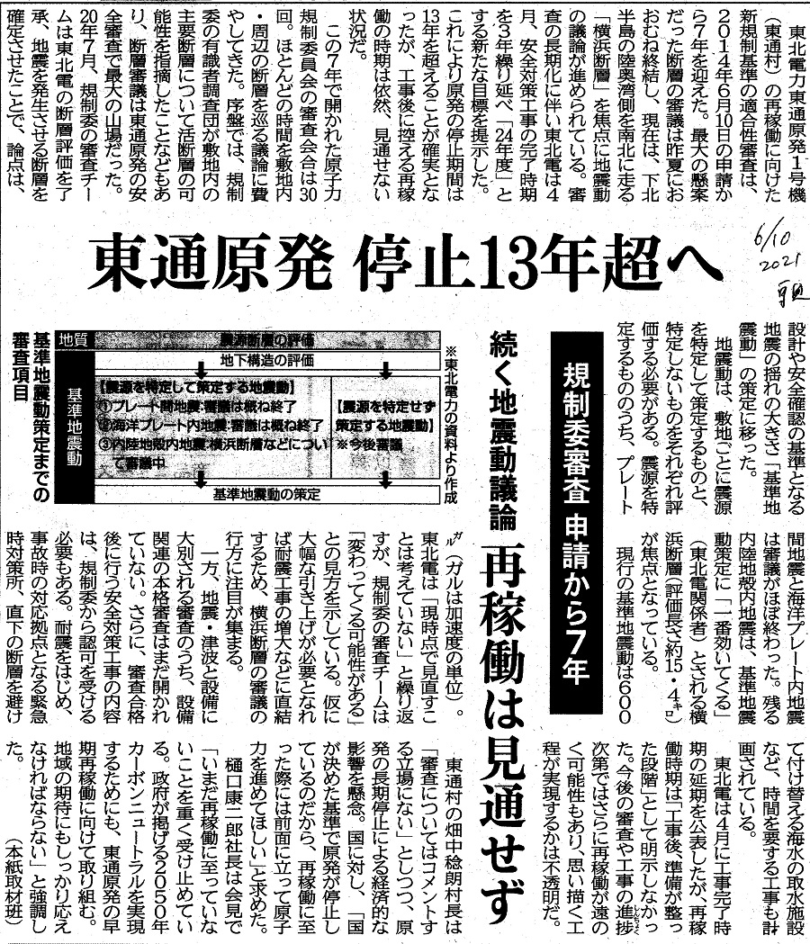 | [2021_06_10_04]東通原発 停止13年超へ 規制委審査 申請から7年 続く地震動議論 再稼働は見通せず(東奥日報2021年6月10日) |