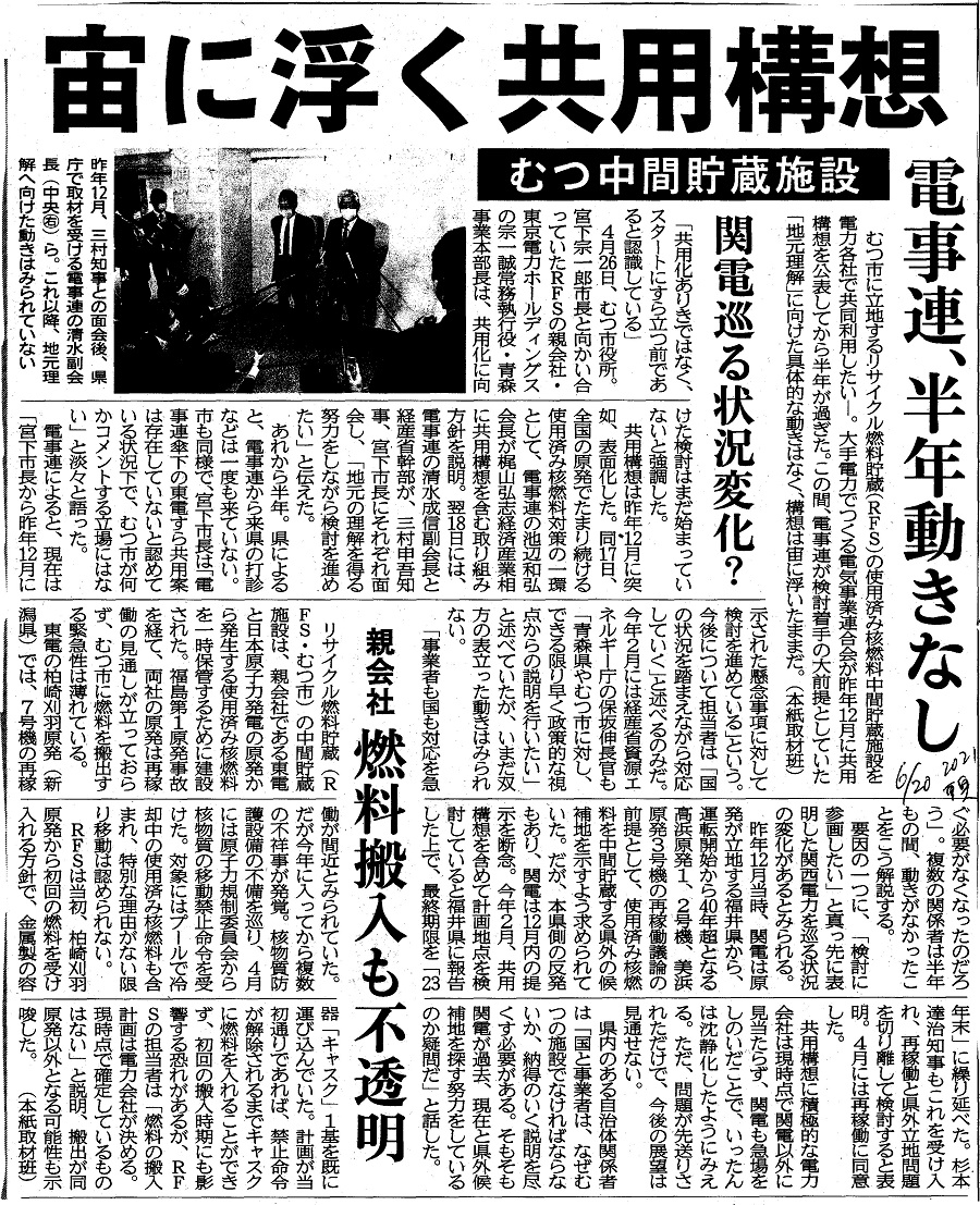| [2021_06_20_03]むつ中間貯蔵施設 宙に浮く共用構想 電事連、半年動きなし 関電巡る状況変化? 親会社 燃料搬入も不透明(東奥日報2021年6月20日) |