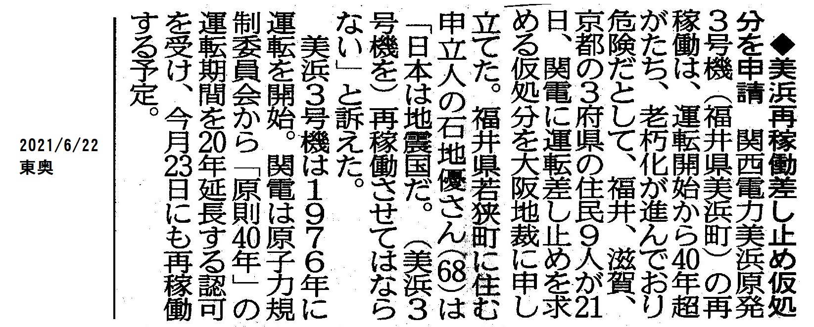 [2021_06_22_01]美浜再稼働差し止め仮処分を申請(東奥日報2021年6月22日)