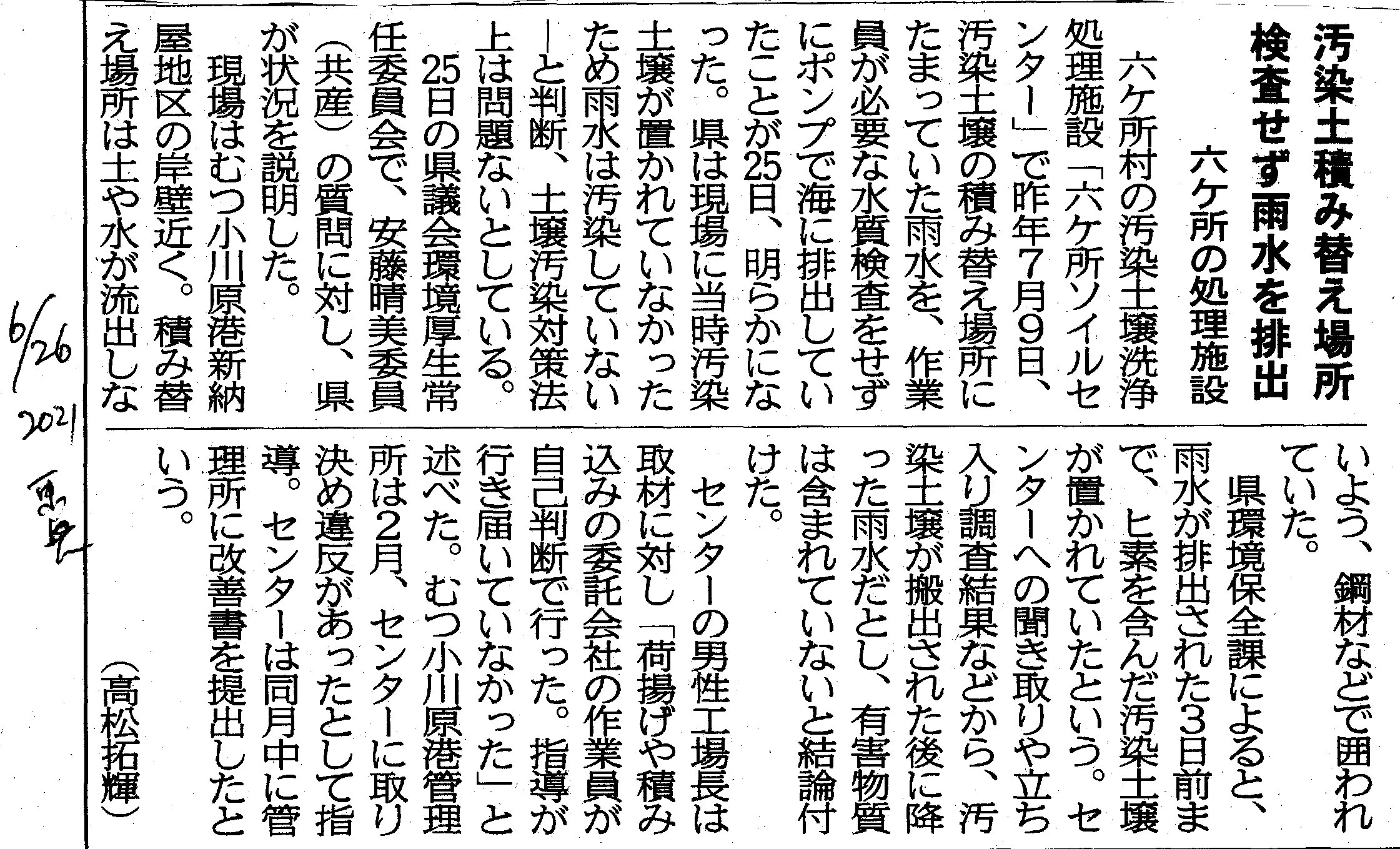 | [2021_06_26_01]汚染土積み替え場所 検査せず雨水を排出 六ケ所の処理施設(東奥日報2021年6月26日) |