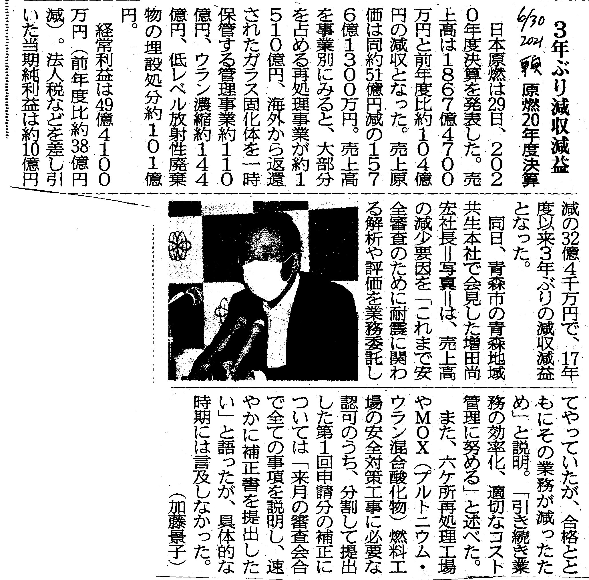 | [2021_06_30_08]3年ぶり減収減益 原燃20年度決算(東奥日報2021年6月30日) |