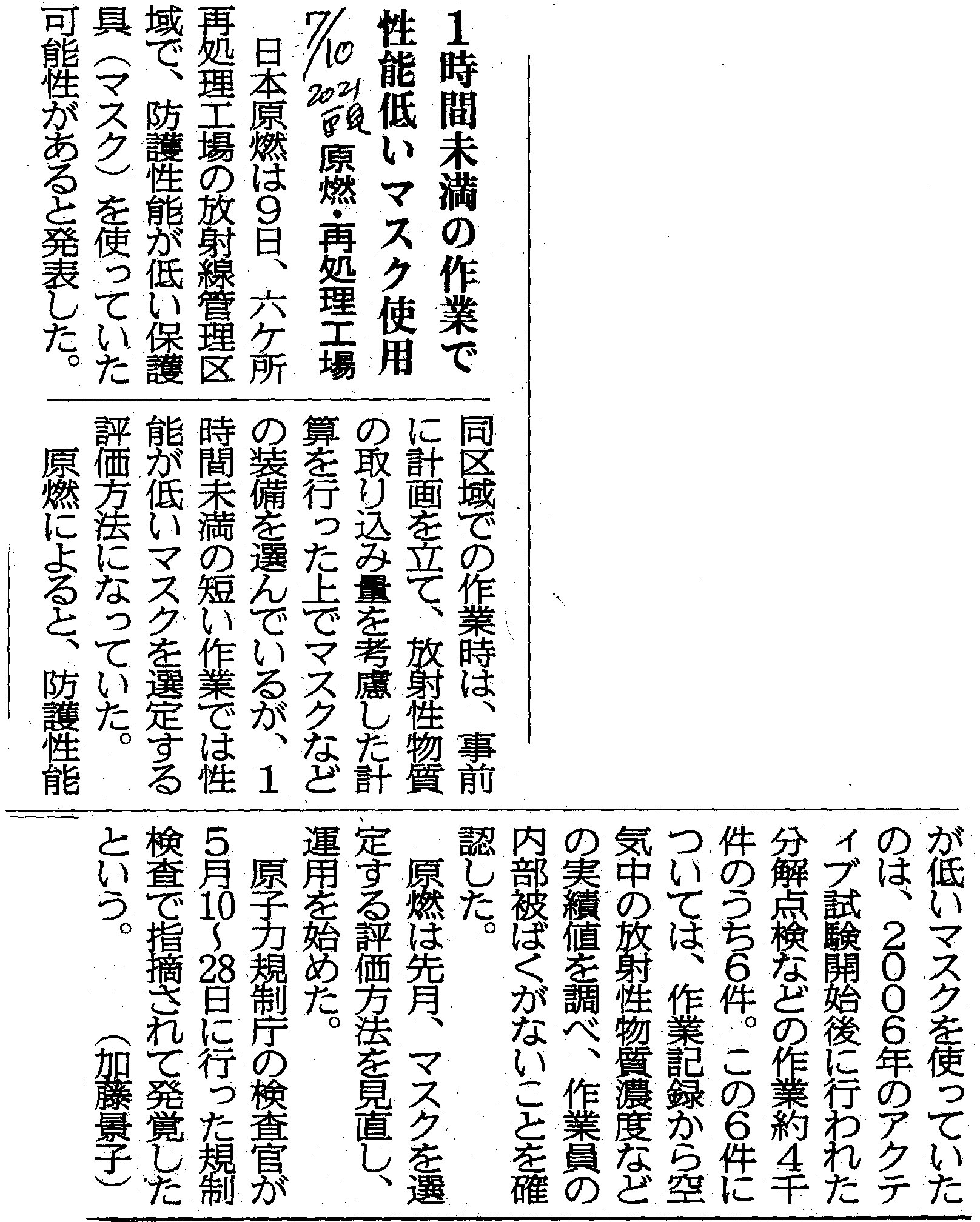 | [2021_07_10_08]1時間未満の作業で 性能低いマスク使用 原燃・再処理工場(東奥日報2021年7月10日) |