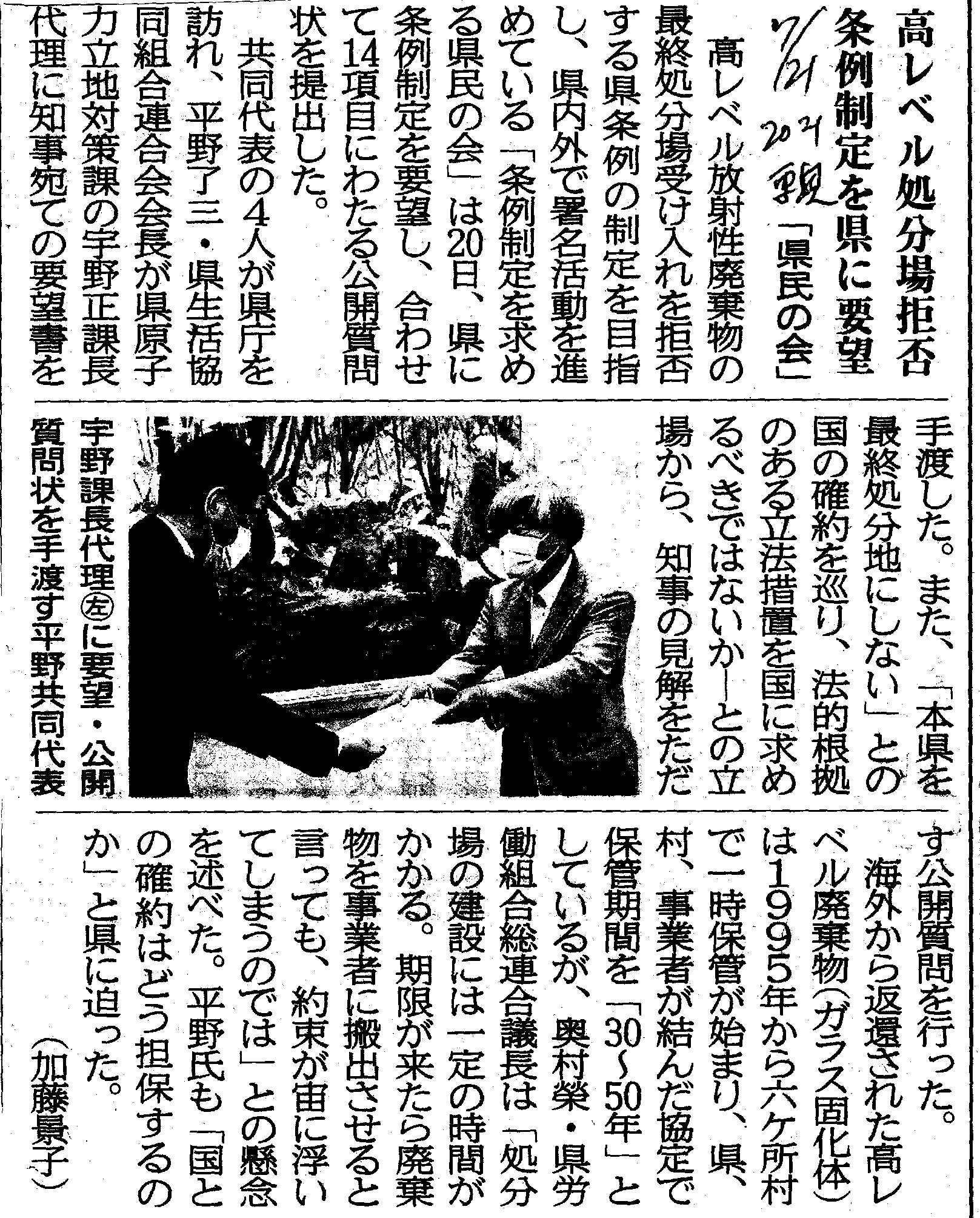 | [2021_07_21_07]高レベル処分場拒否条例制定を県に要望 「県民の会」(東奥日報2021年7月21日) |