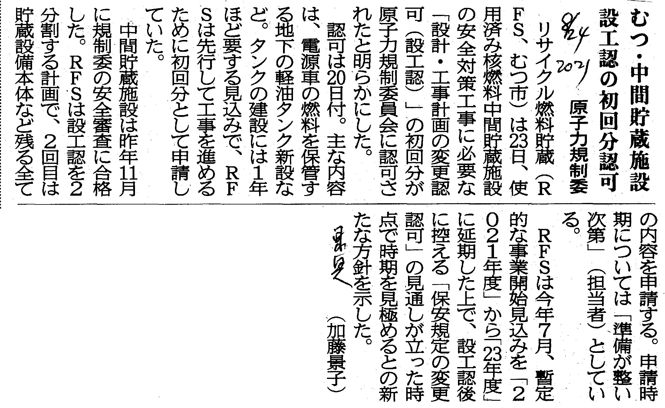 | [2021_08_24_02]むつ・中間貯蔵施設 設工認の初回分認可 原子力規制委(東奥日報2021年8月24日) |