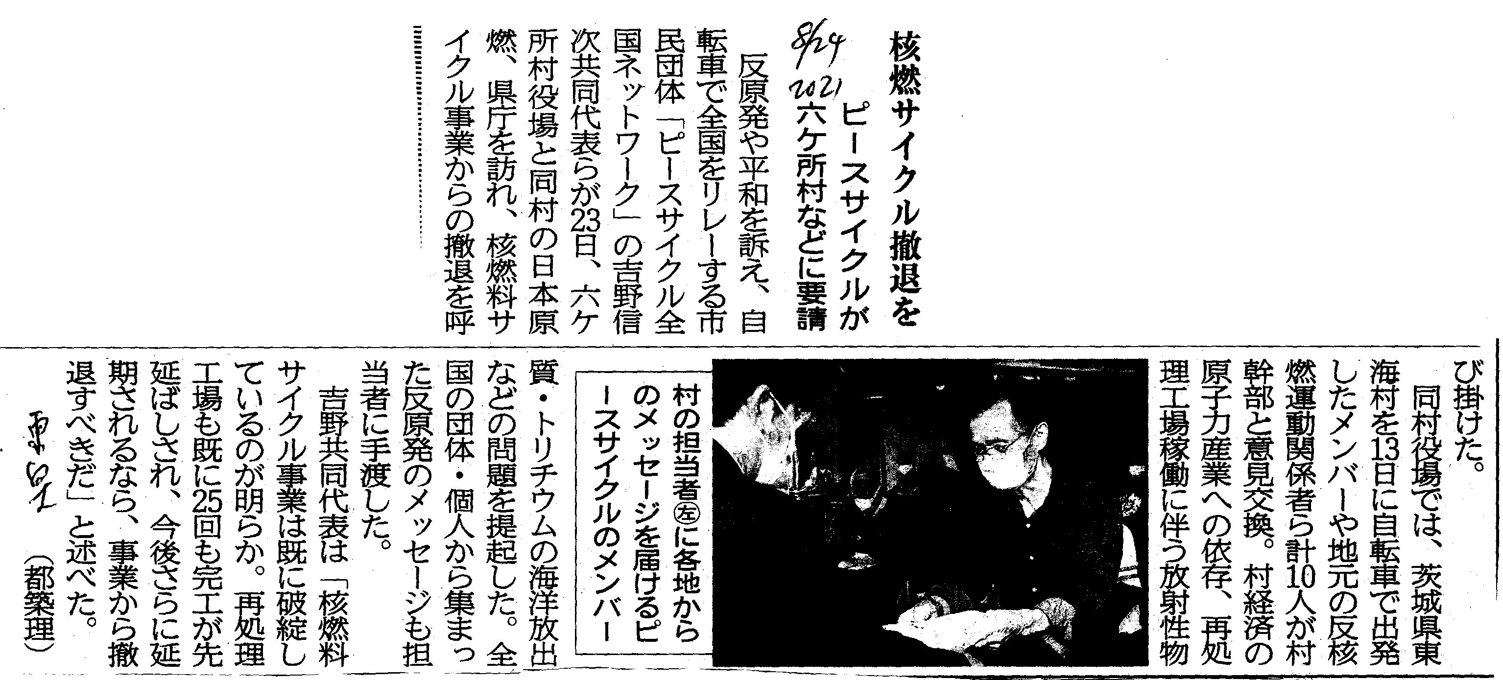 | [2021_08_24_03]核燃サイクル撤退を ピースサイクルが六ケ所村などに要請(東奥日報2021年8月24日) |