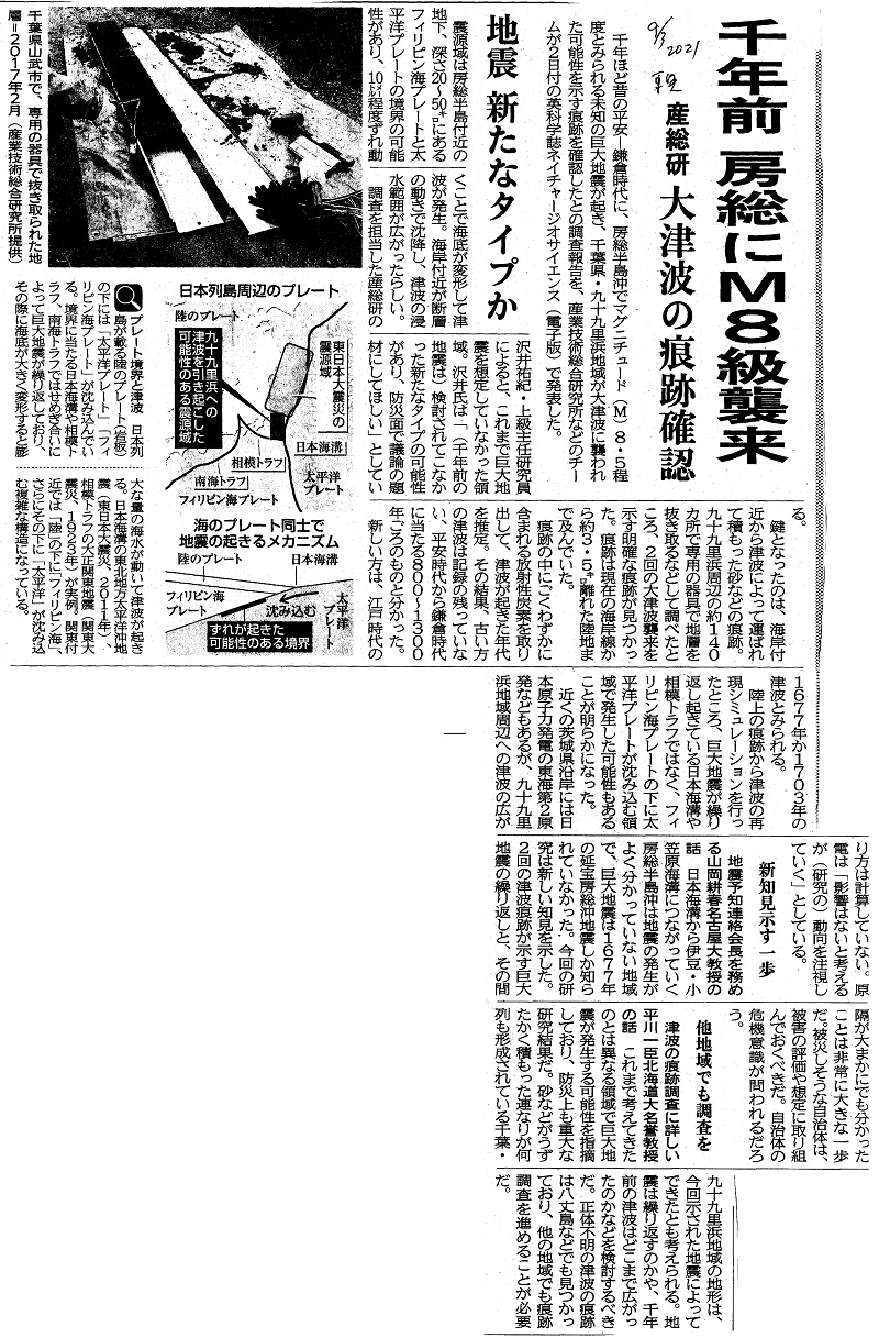 | [2021_09_03_07]千年前 房総にM8級襲来 産総研 大津波の痕跡確認 地震 新たなタイプか 新知見示す一歩 他地域でも調査を(東奥日報2021年9月3日) |
