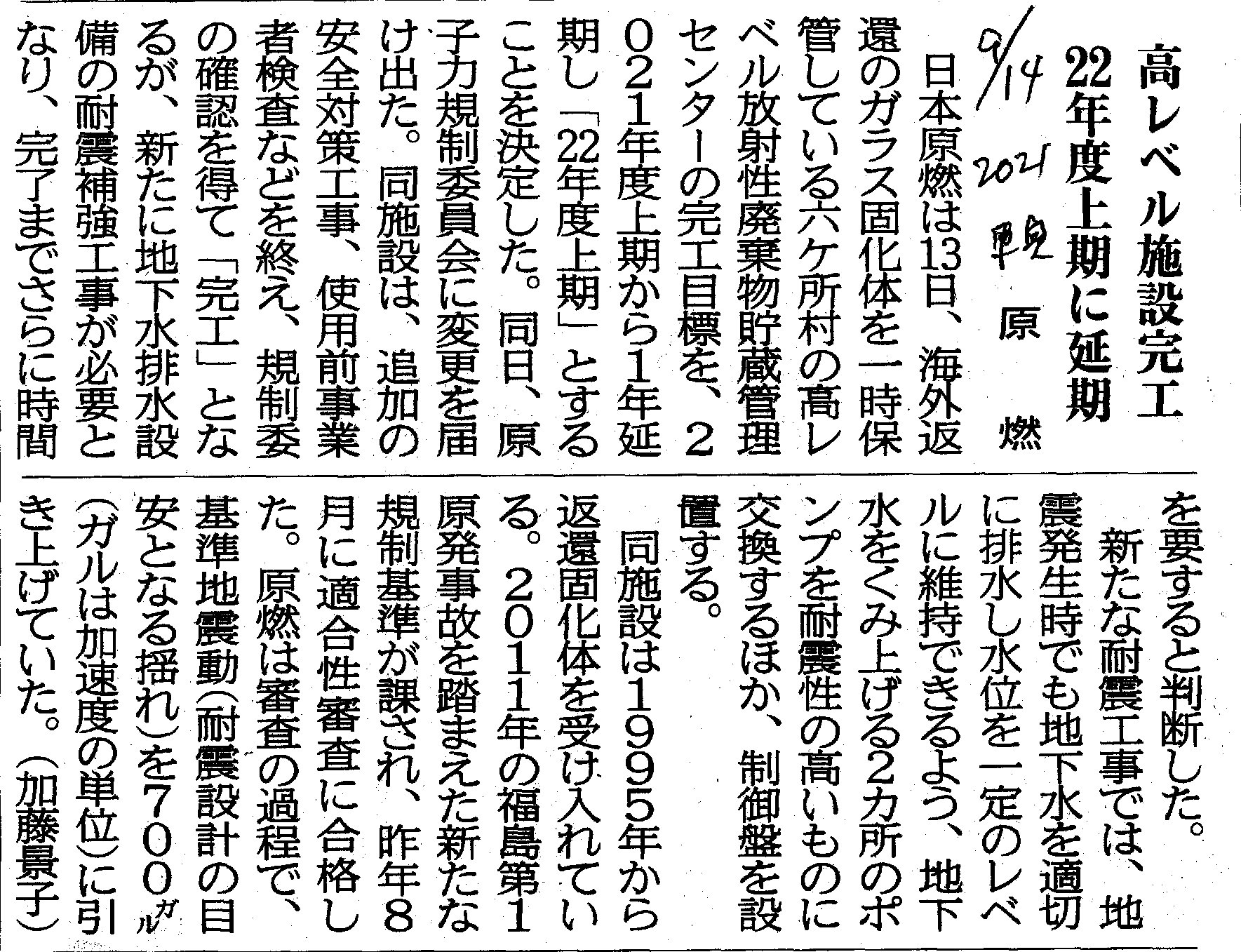 | [2021_09_14_07]高レベル施設完工 22年度上期に延期 原燃(東奥日報2021年9月14日) |