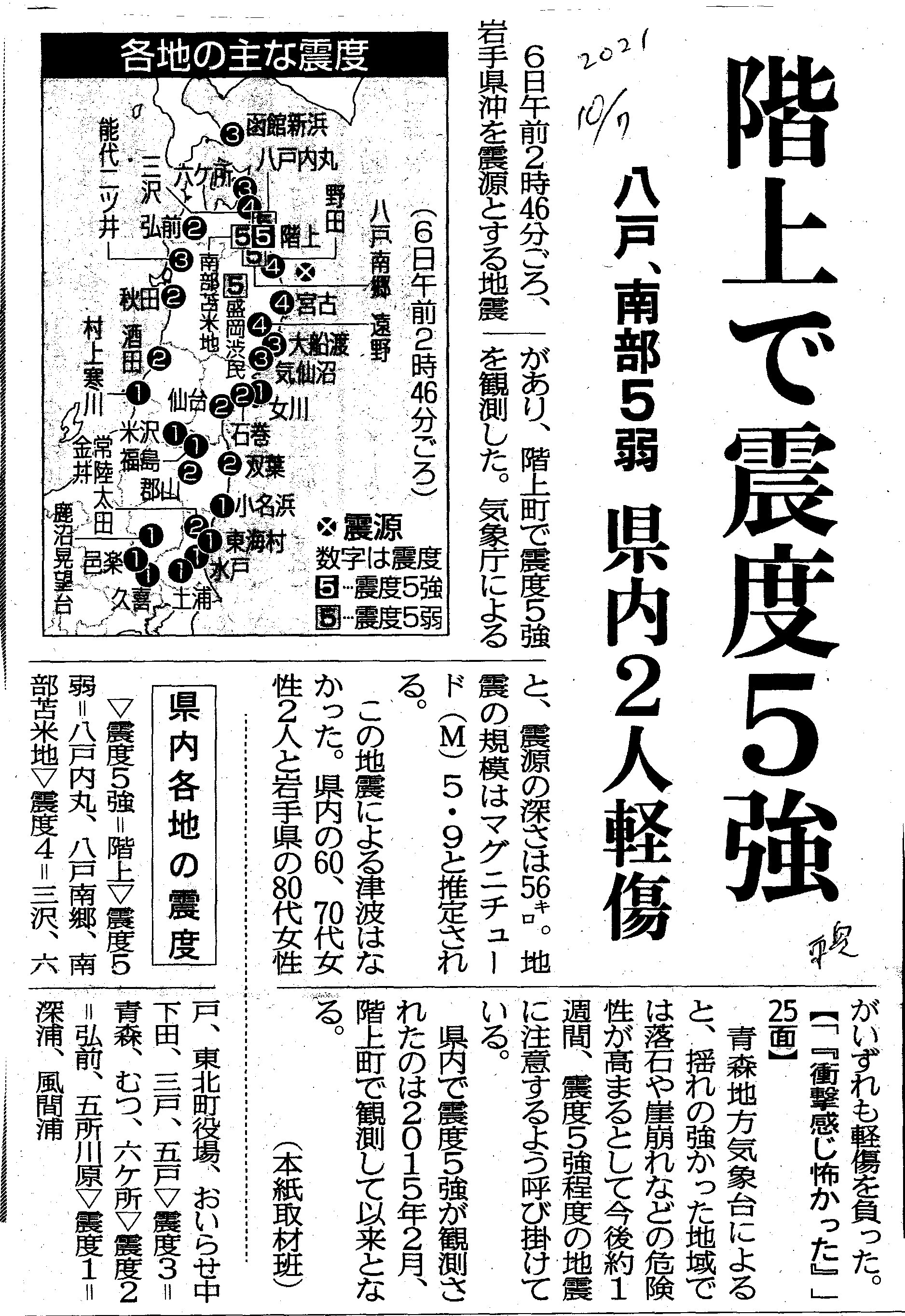 [2021_10_07_10]階上で震度5強 八戸、南部5弱 県内2人軽傷(東奥日報2021年10月7日)