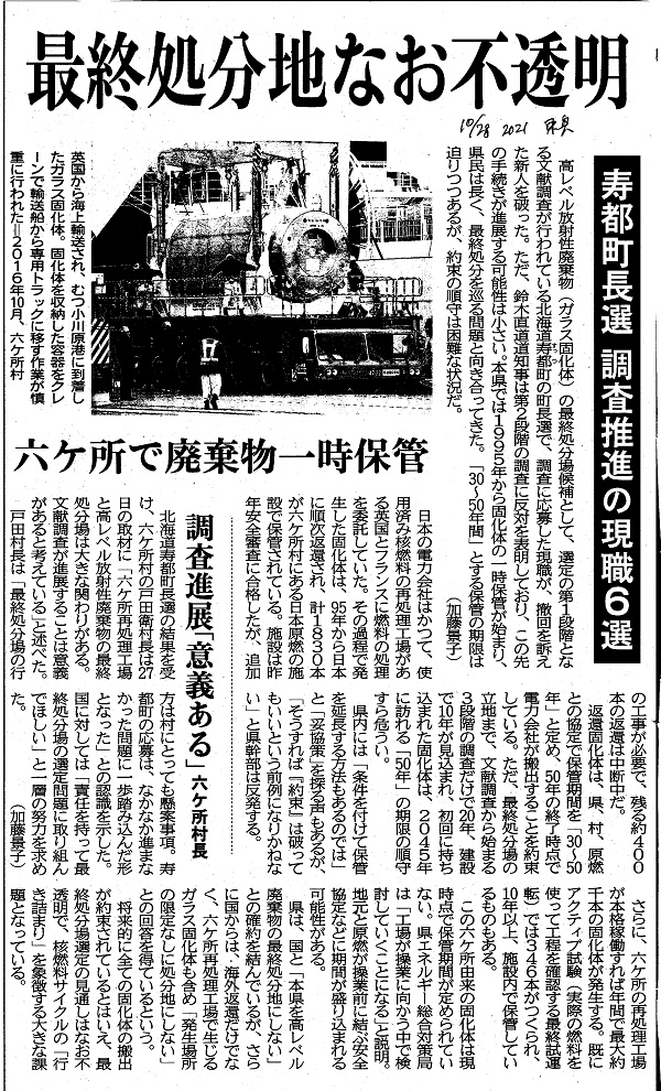 | [2021_10_28_10]最終処分地なお不透明 寿都町長選 調査推進の現職6選 六ケ所で廃棄物一時保管 調査進展「意義ある」六ケ所村長(東奥日報2021年10月28日) |