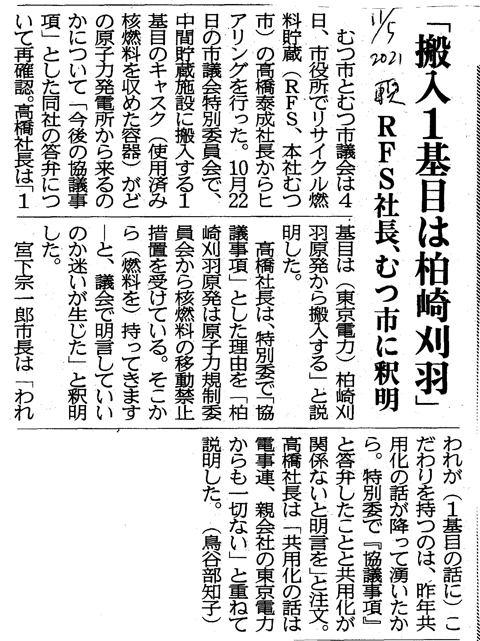 | [2021_11_05_09]「搬入1基目は柏崎刈羽」 RFS社長、むつ市に釈明(東奥日報2021年11月5日) |