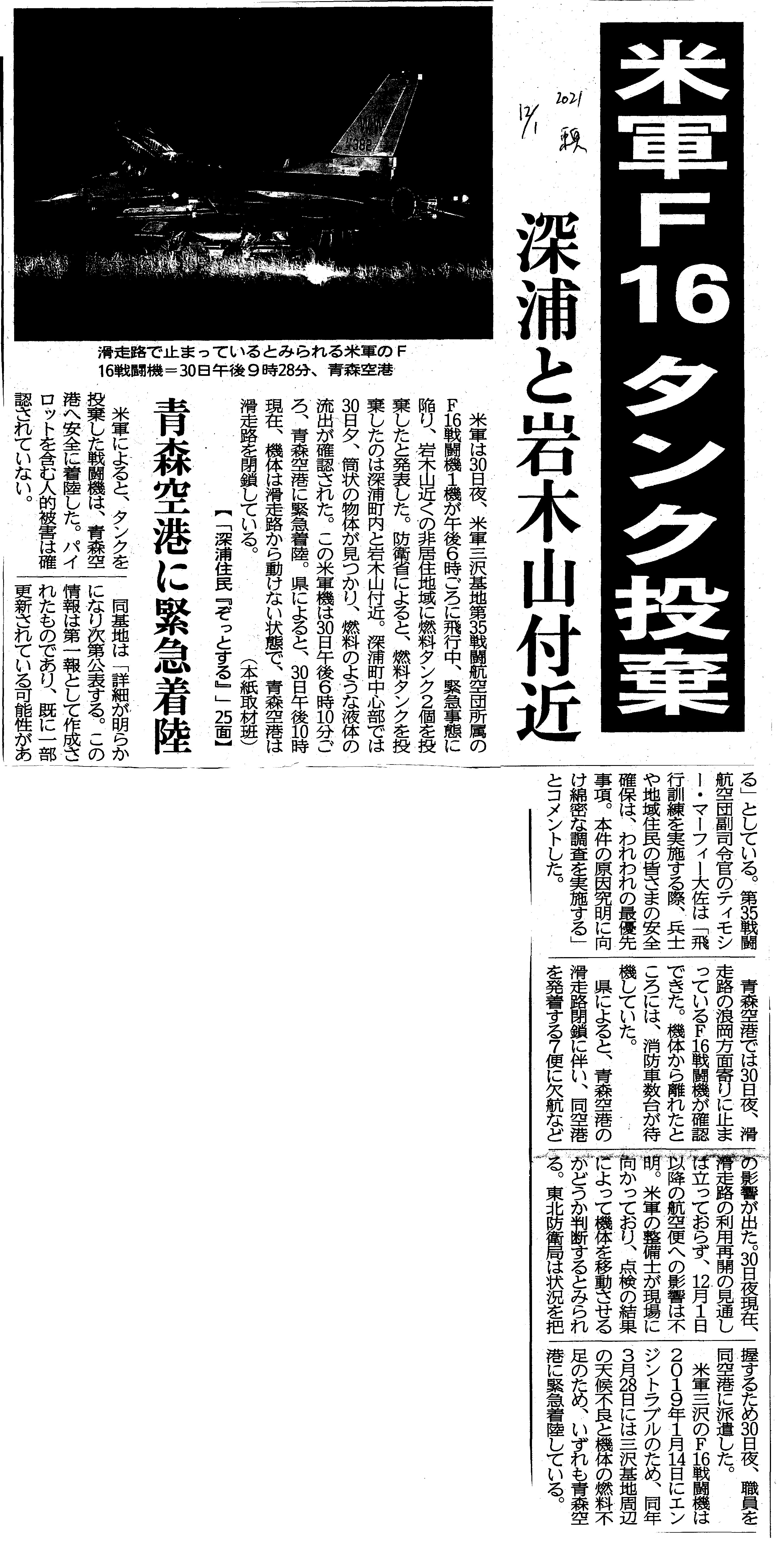 [2021_12_01_02]米軍F16 タンク投棄 深浦と岩木山付近 青森空港に緊急着陸(東奥日報2021年12月1日)